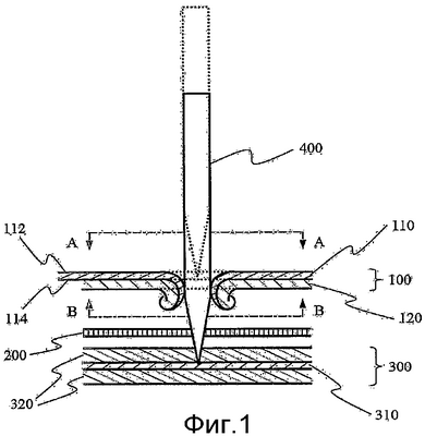 Теперь настоящее изобретение будет описано более подробно со ссылками на фиг.1, схематически показывающую крайнюю снаружи часть в процессе, когда в структуру элемента в соответствии с настоящим изобретением проникает гвоздь.