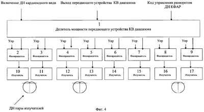 На фиг.4 приведена структурная схема устройства, реализующего заявляемый способ питания элементов передающей кольцевой – дуговой ФАР. Устройство содержит управляемый цифровым кодом делитель мощности передающего устройства KB диапазона 1, соединенный с выходом передающего устройства KB диапазона, управляемые цифровым кодом восемь фазовращателей 2-9, восемь излучателей 10-17 фазированной антенной решетки (формирующие ДН кардиоидного вида в диапазоне KB ниже 7 МГц и функционирующие независимо друг от друга в диапазоне KB выше 7 МГц), причем выход передающего устройства KB диапазона соединен с первым входом делителя мощности передающего устройства KB диапазона 1, на второй вход которого подается управляющий сигнал включения ДН кардиоидного вида, восемь выходов делителя мощности передающего устройства KB диапазона 1 соединены с первыми входами фазовращателей 2-9 соответственно, на вторые входы фазовращателей 2-9 подается цифровой код управления от устройства управления, выходы фазовращателей 2-9 соединены с соответствующими излучателями фазированной антенной решетки 10-17, на третий вход блока 1 подается код управления поворотом ДН КФАР в азимутальной плоскости.