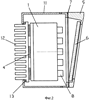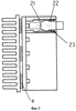 Расположение модулей в держателе выбрано максимально плотным с учетом необходимых условий отвода тепла, технологических возможностей изготовления держателя и возможностей перемещения модулей при регулировке направления излучения. Максимальное количество лазерных модулей в излучателе может быть, например, 36 и больше и определяется техническими задачами и технологическими возможностями. Минимальное количество модулей в излучателе может быть равно двум. Оптимальным количеством модулей с точки зрения применения такого устройства может быть 25 (двадцать пять). Если количество лазерных модулей четное, то их располагают симметрично относительно продольной плоскости симметрии корпуса излучателя. Количество модулей может быть нечетным, тогда их располагают симметрично относительно продольной оси симметрии корпуса излучателя. Держатель лазерных модулей 1 крепится к корпусу 11 винтами. К держателю 1 в свою очередь крепятся термохолодильники 4, обеспечивающие охлаждение лазерных модулей при работе в условиях повышенной температуры окружающей среды. К термохолодильникам 4 с противоположной держателю 1 стороны крепится радиатор 12. Оба соединения выполняются с оптимальным тепловым контактом. Количество термохолодильников в зависимости от их мощности может выбираться, например, от 2 до 6. На держателе 1 устанавливают датчики температуры – 24, сигналы от которых подаются на плату контроля температуры 10.
