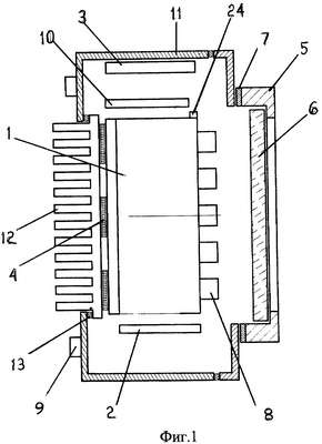 Позициями на чертежах обозначены: 1 – держатель лазерных модулей, 2 – схема управления лазерными модулями, 3 – нагреватель, 4 – термохододильник, 5 – передняя крышка, 6 – выходное окно, 7 – герметизирующая прокладка, 8 – лазерный модуль, 9 – электрический разъем, 10 – плата контроля температуры, 11 – корпус излучателя, 12 – радиатор, 13 – герметизирующая прокладка, 14 – корпус лазерного модуля, 15 – цилиндрическая часть поверхности корпуса лазерного модуля, 16 – сферическая часть поверхности корпуса лазерного модуля, 17 – схема управления лазерным диодом, 18 – лазерный диод, 19 – стакан (держатель микрообъектива), 20 – микрообъектив, 21 – шайба с внутренней сферической поверхностью и резьбовым соединением, 22 – шайба с внутренней сферической поверхностью, 23 – гайка, 24 – датчик температуры.