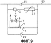 На фиг.9 представлена схема, где устройство представлено как устройство защиты от перенапряжений для последовательного конденсатора. В линии 30 высокого напряжения с последовательным конденсатором 31 размещено устройство защиты от перенапряжений, содержащее варистор 32, основной искровой промежуток 1 и устройство 25 механического контакта, три указанных элемента соединены параллельно. Устройство 12 измерения тока размещено последовательно с варистором.