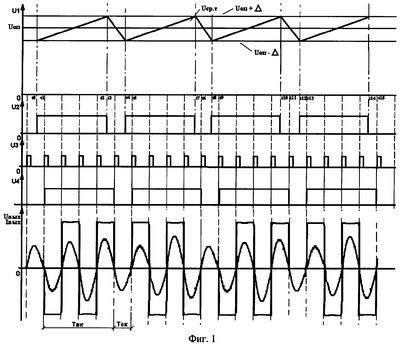 На фиг.1: U1 – напряжение на выходе преобразователя 17; U2 – сигнал на выходе компаратора 18; U3 – сигнал блока синхронизации 19; U4 – сигнал компаратора 18, синхронизированный с сигналом блока 19; Uоп – величина стабилизируемого значения (уставка) технологического параметра; – величина допустимого отклонения технологического параметра от уставки; Uвых – напряжение между точками А и В на выходе мостового инвертора; Iвых – ток нагрузки на выходе мостового инвертора; Твк – временной интервал вынужденных колебаний тока в контуре; Тск – временной интервал свободных колебаний тока в контуре.