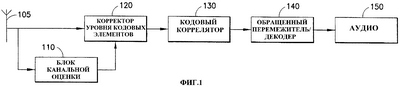 После корректора традиционный кодовый коррелятор, известный специалистам в данной области, например описанный в книге Джона Проукиса (John Proakis) “Digital Communications”, McGraw Hill, выделяет мощность, связанную с конкретным кодом, который несет нужные данные. Традиционный обращенный перемежитель выделяет конкретные нужные данные. Блок 150, обозначенный «Аудио», схематически представляет традиционные схемы, которые преобразуют цифровые сигналы, обработанные к этому моменту, в аналоговый аудиосигнал (или в случае передачи данных направляет данные на следующую ступень обработки). Для удобства выражения в формуле изобретения выходной сигнал обращенного перемежителя 140 назван просто «выходным сигналом», и процессы, представленные блоком 150 (суммирование блока данных, осуществление цифроаналоговой обработки, сглаживание, усиление и т.д.), названы обработкой выходного сигнала.