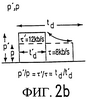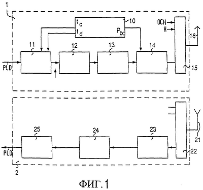 Длительность td пакета во времени, момент t0, относящийся к началу кадра, а также мощность Рtx передатчика, с которой передается пакет, являются заранее заданными величинами для генератора 11 кадров и каскада 14 управления мощностью, полученными от блока 10 управления. Мощность Рtx передатчика управляется так, чтобы в приемнике 2 принималась конкретная принятая мощность Р. Предпочтительно мощность Рtx передатчика должна выбираться так, чтобы принятая мощность Р была пропорциональна выбранной скорости передачи данных передаваемого пакета. Это означает, что если продолжительность td пакета во времени выбрана более короткой, при том же размере блока полезного сигнала, блок 10 управления будет выбирать мощность Рtx передатчика соответственно выше, чтобы гарантировать соответственно более высокую принятую мощность Р (ср. фиг.2в). Обозначениями Р’, t’d и ‘ обозначены соответственно другая принятая мощность, другая выбранная скорость передачи данных и другая продолжительность во времени. В данном примере =8 кб/с и ‘=12 кб/с.