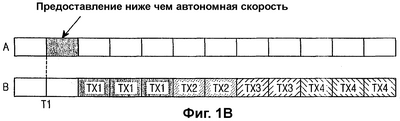 “А” является прямым управляющим каналом для передачи Предоставления с БПС, а “В” является обратным каналом пакетных данных для передачи данных на БПС. Предоставление является информацией, относящейся к скорости данных ниже, чем максимальная обратная автономная скорость. Если БПС передает Предоставление на МС в момент Т1 с тем чтобы ограничить максимальную скорость данных, то МС определяет Предоставление как временно ограничивающий сигнал для скорости данных, тем самым МС выделяет скорость данных, соответствующую Предоставлению, только в момент Т2, который является первым моментом передачи для данных. То есть скорость передачи данных ниже, чем максимальная автономная скорость, назначается на основе Предоставления только в первом интервале, принимающем Предоставление. В этом случае, если новое обслуживание или МС, имеющие более высокий приоритет, непрерывно запрашивает ресурсы, Предоставление должно передаваться непрерывно с тем, чтобы ограничить автономную скорость. То есть БПС передает Предоставление на МС в каждый момент времени (с Т1 до Т4) передачи для ограничения автономной скорости. Соответственно, каналы Предоставления становятся загруженными, тем самым вызывая прямые издержки. По этой причине трудно облегчить управление обратной скоростью.