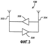 На фиг.3 представлена блок-схема известного повторителя 120. Повторитель 120 включает в себя донорную антенну 302 для приема сигналов, усилитель 308 для усиления сигналов, принятых донорной антенной 302, и серверную антенну 304 для передачи (или ретрансляции) сигналов, принятых повторителем 120. Также второй усилитель 306 усиливает сигналы, принятые серверной антенной 304, и подает усиленные сигналы на донорную антенну 302. Повторитель 120 может также содержать множество антенн и/или множество усилителей для приема, усиления и передачи сигналов прямой линии 122А, 124А связи и обратной линии 214В, 122В связи по отдельности.