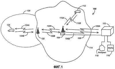 Хотя зону охвата сети 100 сотовой телефонной связи можно расширить путем простого добавления дополнительных базовых станций 104 с целью охвата дополнительной географической территории, иногда такой шаг оказывается экономически неоправданным. Во многих случаях, например, территория, которую предполагается охватить, имеет трафик, достаточный лишь для того, чтобы обосновать использование вместо базовой станции 104 повторителя 120. Повторитель 120 принимает передачи как от мобильной станции 126, так и от базовой станции 104, и действует как промежуточное звено между ними, по существу как портал связи типа «коленчатый канал» (“bent pipe”). При использовании повторителя 120 эффективный диапазон базовой станции 104 расширяется, охватывая расширенную зону 128 обслуживания. Повторители 120 могут включать в себя наземные повторители, повторители, развернутые в атмосфере, либо повторители, размещенные на спутниках, находящихся на геосинхронной орбите (GEO), средней околоземной орбите (MEO), низкой околоземной орбите (LEO). Повторители 120 могут также быть стационарными либо мобильными.