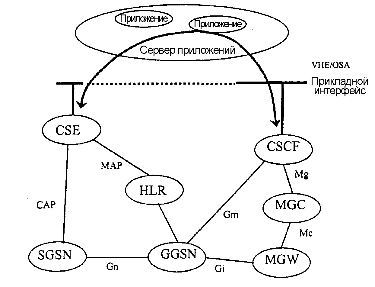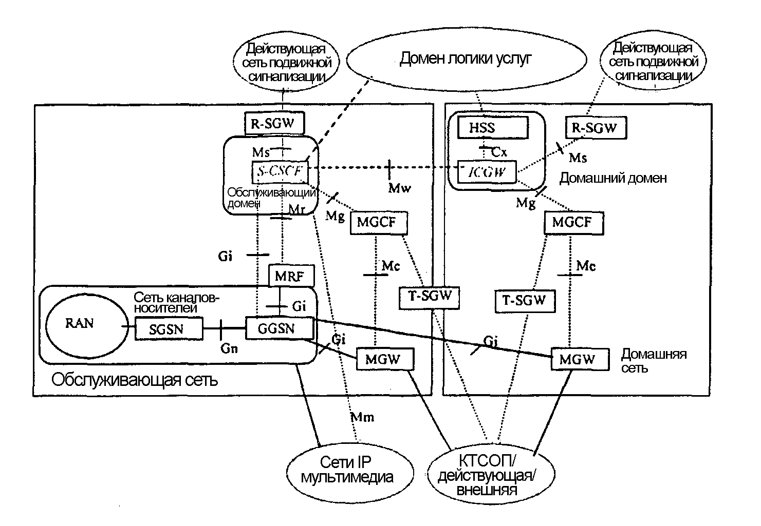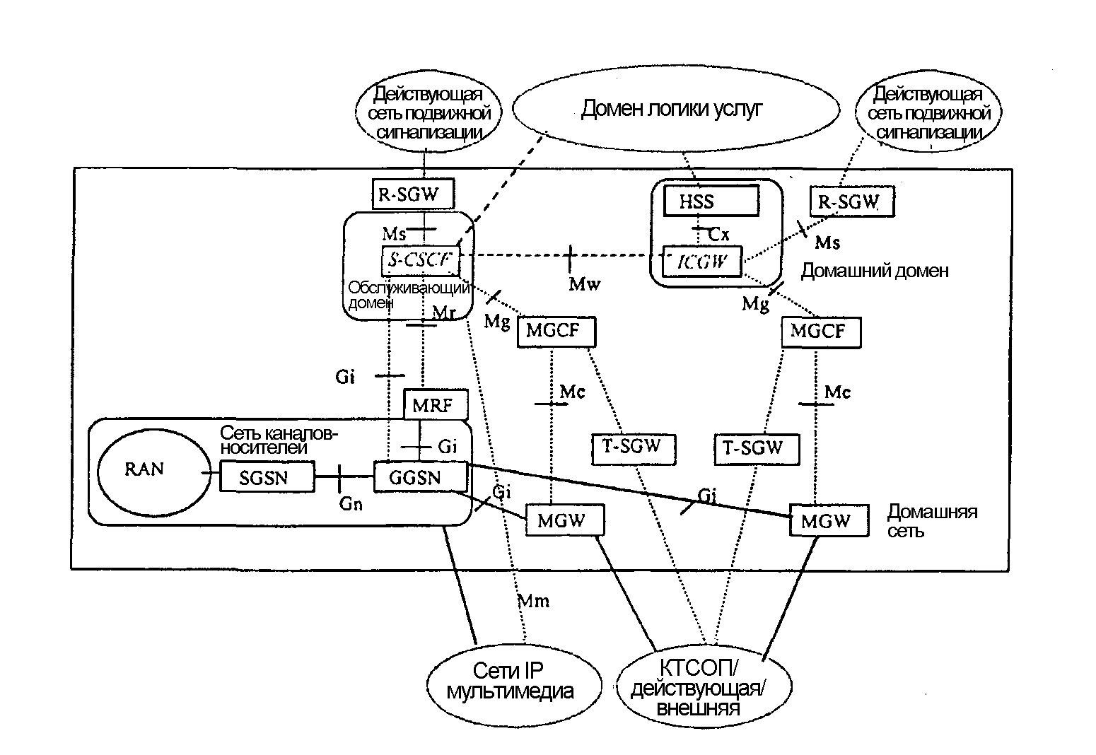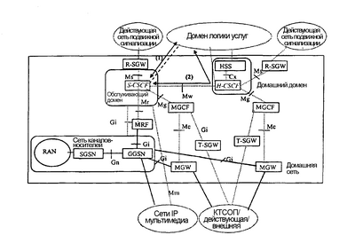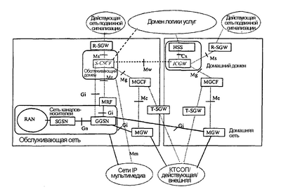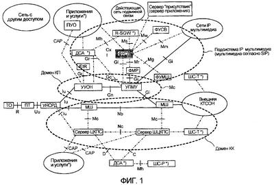 В настоящем изобретении сервер “присутствия” помещен в подсистему Интернет-мультимедиа архитектуры, предложенной ПП3П и соответствующей 5 версии, как часть “глобальной сети приложений и услуг”. Подсистема мультимедиа, использующая Интернет-протокол, обращается ко множеству элементов базовой сети, которые используют услуги, обеспечиваемые доменом с коммутацией пакетов согласно архитектуре ПП3П, соответствующей 5 версии и предназначенной для предоставления мультимедийных услуг. Элементами подсистемы мультимедиа, использующей Интернет-протокол, являются функция управления состоянием вызова (ФУСВ CSCF), функция управления медиа-шлюзом (ФУМШ (MGCF), функция медиа-ресурсов (ФМР, MRF) и некоторые составляющие для адаптации. Представление расширенной архитектуры показано на Фиг.1.