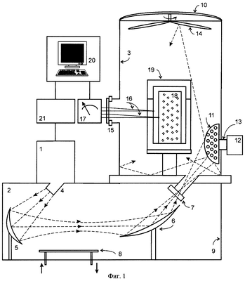 Микроволновая камера 3 для спекания изготовлена из нержавеющей стали в виде цилиндрической камеры диаметром около 500 мм и высотой 600 мм. Охлаждаемая водой вакуумно-плотная камера 3 позволяет проводить нагрев изделий в вакууме и любой газовой атмосфере. Она уплотняется прозрачным для микроволнового излучения входным окном 7 и снабжена расположенным между цилиндрической боковой частью камеры 3 и ее крышкой 10 кольцеобразным резиновым уплотнением (не показанным на чертеже), защищенным от попадания на него микроволнового излучения. Камера 3 для спекания является ненастроенным многомодовым резонатором. Входящий в камеру 3 волновой пучок отражается рассеивателем 11 излучения, выполненным в виде металлической полусферы с углублениями диаметром порядка половины длины волны излучения. Рассеиватель 11 вращается электрическим мотором 12 с помощью эксцентрического механизма 13. Волновой пучок возбуждает одновременно сотни собственных мод камеры 3. Электромагнитные поля собственных мод образуют в результате суперпозиции достаточно однородное распределение микроволновой энергии во всем объеме камеры 3. Дополнительное выравнивание распределения микроволновой энергии обеспечивается перемешивателем мод 14. Перемешиватель мод 14, выполненный в виде пропеллера специальной конфигурации, размещен на крышке 10 микроволновой камеры 3. Перемешиватель мод 14 приводится в движение электрическим мотором 12 и совершает одновременно вращение и колебание. Микроволновая камера 3 снабжена фланцем 15, имеющим электрически изолированные вводы для подключения термопар 16, электрический сигнал от которых поступает на измерительное устройство 17.