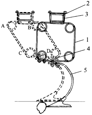 На чертеже сплошной линией изображена предложенная упругая подвеска в не деформированном состоянии, а пунктирными линиями – при обходе камня.