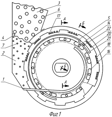 Пакет дисков в нужном положении скрепляется двумя винтами 22. Основание 10, контактирующее с вакуумной камерой 8, устанавливается жестко на валу 9, равномерно распределенные по окружности просасывающие отверстия 11 одной стороной сообщающиеся с вакуумной камерой 8, другой – с просасывающей щелью 23 и с присасывающими отверстиями 14 первой накладки 13. Первая накладка 13 имеет равномерно распределенные по окружности присасывающие отверстия 14, располагающиеся напротив просасывающих отверстий основания 10. Вторая накладка 15 выполнена в форме диска с наружным диаметром больше диаметра первой накладки на 2-5 мм, имеет равномерно распределенные по окружности продолговатые отверстия 16 длиной 1/2…2/3 расстояния между присасывающими отверстиями 14 первой накладки, расположенные на радиусе присасывающих отверстий шириной больше диаметра присасывающих отверстий на 3-5 мм. По периметру второй накладки 15 на радиусе первой накладки 13 выполнены сквозные вырезы длиной 1/2-2/3 расстояния между просасывающими отверстиями основания 10, и отгибы 17 перпендикулярно накладке на величину толщины первой накладки 18 для создания первой стенки ячеи 18 на основании наружного периметра гладкой цилиндрической поверхности первой накладки 13. По наружной поверхности вторая накладка 15 имеет загиб перпендикулярно диску в сторону первой накладки 13 на величину ширины первой накладки 13 на радиусе больше радиуса первой накладки 13 на два-пять миллиметров. Третья накладка 19 выполнена в форме диска с внутренним радиусом, равным наружному радиусу продолговатых отверстий 16 второй накладки 15. По наружному периметру на радиусе, равном наружному радиусу второй накладки 15 накладка имеет загиб во внутрь на величину толщины пакета первой 13 и второй накладки 15. По периметру третьей накладки 19 выполнены сквозные вырезы длиной 1/2-2/3 расстояния между просасывающими отверстиями основания 10 и отгибы перпендикулярно накладке на величину толщины суммы первой и второй накладки для создания второй стенки 20 ячеи 18. На валу установлена ворошилка 24.