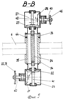 На фиг.5 – сечение В-В на фиг.4, вертикальный разрез конических редукторов, втулки вилки самоустанавливающегося колеса, полого шлицевого вала и валов верхнего и нижнего конического редукторов в кинематической цепи привода полого вальца в качестве плодосдвигающего рабочего органа.