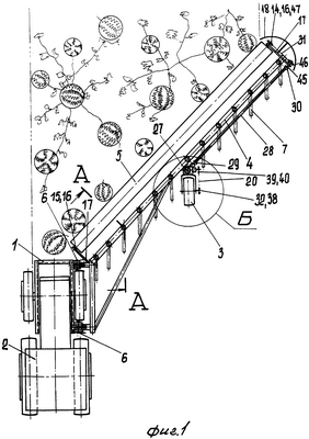 Удаленный конец боковины 4 от шарниров 6 рамы 1 снабжен Э-образным упругим элементом 18. Упругим элементом 18 плоды отводятся от острой кромки полого цилиндра и узлов его привода. Упругий элемент 18 средствами крепления 19 закреплен на правом кронштейне 17 боковины 4 (см. фиг.1 и 2).