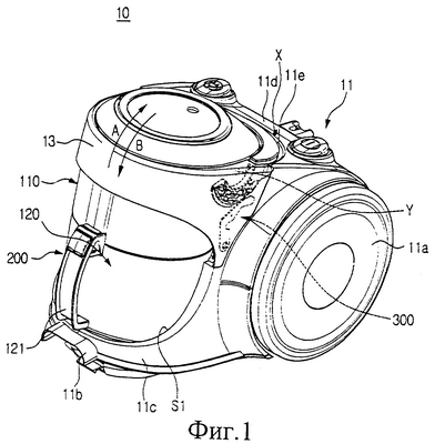 Между тем, сепаратор 110 установлен в крышке 13 с возможностью его отсоединения. В альтернативном варианте сепаратор 110 прикреплен с возможностью вращения к корпусу 11 без крышки 13. Однако, для удобства технического обслуживания и ремонта, предпочтительней сепаратор 110 устанавливать в крышке 13 с возможностью его отсоединения. Сепаратор 110 поворачивается вокруг оси Х шарнира вместе с крышкой 13 в направлении стрелок А или В тогда, когда сепаратор 110 не сцеплен с приемником 120. Так как нижняя часть камеры S1 наклонена к задней стороне корпуса 11 пылесоса, то поворот крышки 13 и сепаратора 110 в направлении стрелок А или В осуществляется более свободно.