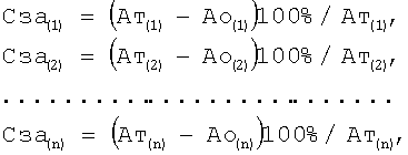 где Сза(1) – состояние зрительного аппарата первого диапазона (центрального); Ат(1) – среднее значение амплитуды переменного синусоидального светового потока (амплитуды мельканий) для глаза в его утомленном (текущем) состоянии в первом диапазоне; Ао(1) – среднее значение амплитуды переменного синусоидального светового потока (амплитуды мельканий) для глаза в его отдохнувшем (исходном) состоянии в первом диапазоне; Сза(2) – состояние зрительного аппарата второго диапазона; Ат(2) – среднее значение амплитуды переменного синусоидального светового потока (амплитуды мельканий) для глаза в его утомленном (текущем) состоянии во втором диапазоне; Ао(2) – среднее значение амплитуды переменного синусоидального светового потока (амплитуды мельканий) для глаза в его отдохнувшем (исходном) состоянии во втором диапазоне; Сза(n) – состояние зрительного аппарата n-ого диапазона; Ат(n) – среднее значение амплитуды переменного синусоидального светового потока (амплитуды мельканий) для глаза в его утомленном (текущем) состоянии в n-м диапазоне; Ао(n) – среднее значение амплитуды переменного синусоидального светового потока (амплитуды мельканий) для глаза в его отдохнувшем (исходном) состоянии в n-м диапазоне, а в случае отсутствия реакции испытуемого на световое раздражение в определенном диапазоне делают вывод о поражении зрительного аппарата в этом диапазоне.