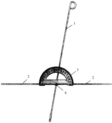 Изобретение поясняется чертежом 1, где изображены бранши 1 и 2 с транспортиром 3, установленным на бранше 1. Бранши соединены шарниром 4, установленным в середине горизонтальной части транспортира. В шарнире выполнено отверстие для продольного перемещения бранши 2. В отверстии может быть размещен фиксатор для бранши 2.