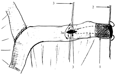 Авторы предлагают свой способ формирования клапанной арефлюксной еюностомы (чертеж). Производится традиционно лапаротомия. Далее, 10-15 см от связки Трейтца производят полное пересечение тощей кишки. После этого осуществляется наложение тонко-тонкокишечного анастомоза конец в бок по Ру. В результате этого формируется «свободный» участок тощей кишки длиной 30 см. Проксимальный участок «свободного» отрезка освобождают от брыжейки, не нарушая кровоснабжение его стенки на протяжении 3 см (1). Далее на него накладывают два боковых шва-держалки (2). После этого, отступя на 3-4 см от границ безбрыжеечного участка «свободного» отрезка тощей кишки, производят продольный разрез стенки тощей кишки на противобрыжеечной поверхности протяженностью 2 см. На края стенки раны накладывают два шва-держалки (3). После этого стенки образовавшейся раны разводят при помощи ранее наложенных двух швов- держалок (3а). Затем через энтеротомную рану, при помощи зажима, захватывают швы-держалки освобожденного от брыжейки отрезка и осуществляют его инвагинацию в просвет кишки до дистального края энтеротомной раны (2а). Далее при помощи узловых швов через все слои стенки кишки противобрыжеечную поверхность инвагинированного отрезка сшивают с дистальным краем энтеротомной раны. Таким образом формируется арефлюксный клапан, за счет прилегания свободно висящего края в просвет кишки. Операция заканчивается формированием энтеростомы по общепринятой методике. Во время кормления зонд легко вводиться в просвет кишки на нужную глубину, а после кормления удаляется. Предложенный авторами способ имеет преимущества: