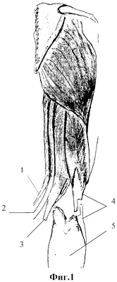 На чертежах изображены: стройная мышца 1, полусухожильная мышца 2, полуперепончатая мышца 3, двуглавая мышца бедра 4, икроножная мышца 5.