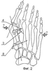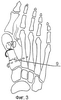 13.11.2001 г. под регионарной анестезией выполнена реконструктивная операция по предложенной методике. Укорочение первой плюсневой кости составила 2 мм, длина ее соответственно 56-2=54 мм. Плюсневый индекс (ПИ) составил 54/66×100=82. Послеоперационный период без осложнений. Металлические конструкции удалены через 6 месяцев. При контрольном осмотре через 2 года больная жалоб в левой стопе не предъявляет. Деформации переднего отдела стоп не наблюдается. Натоптышей под головками I и II плюсневых костей нет. На рентгенограммах правой стопы №819 от 13.01.2003 г. отмечается угол варусного отклонения первой плюсневой кости 7°, угол отклонения первого пальца 14°.