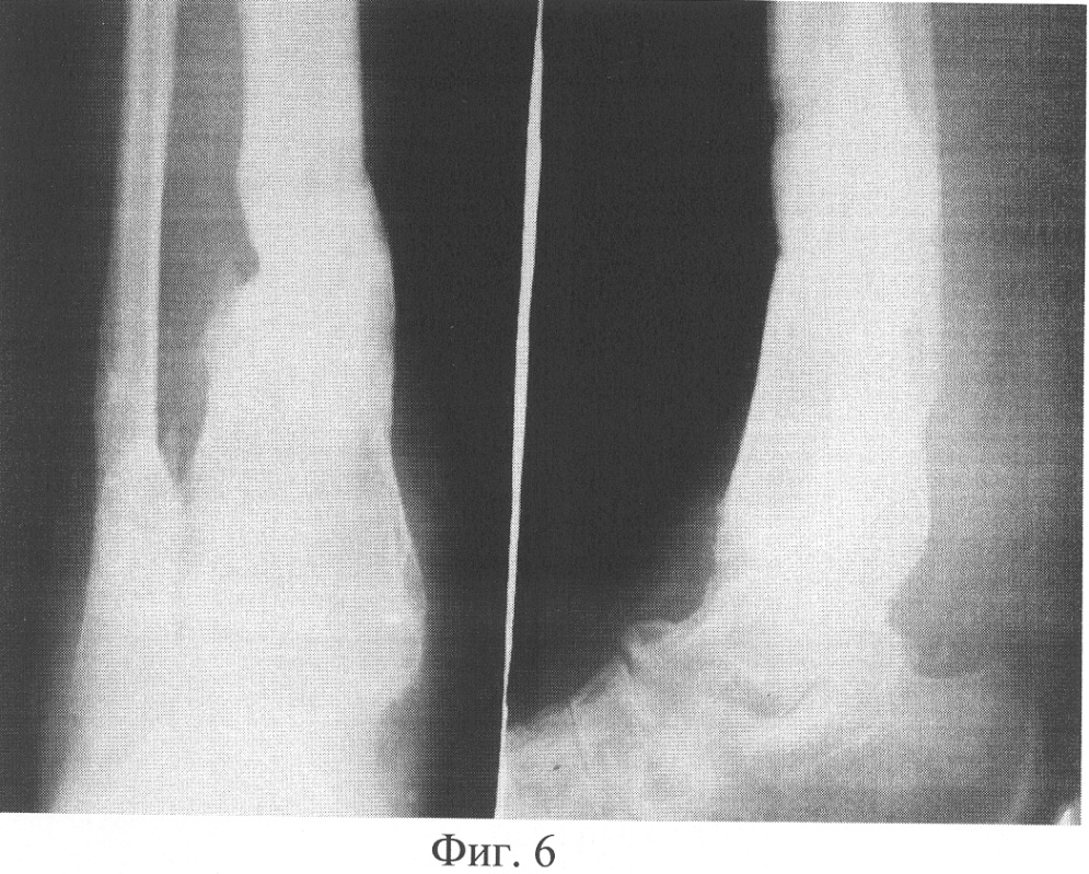 Пример 3. Больной Т., 19 лет, поступил через 745 дней с момента травмы с диагнозом «Посттравматический псевдоартроз нижней трети левой большеберцовой кости. Вальгусно-антекурвационная деформация нижней трети левой голени». Из анамнеза известно, что через 5 дней с момента получения травмы была произведена операция – остеосинтез нижней трети левой большеберцовой кости аппаратом Илизарова. В ходе лечения отмечались следующие жалобы: боли в левой нижней конечности, ограничение функции, возможность передвижения только с двумя дополнительньми опорами. Больной в течение 740 дней лечился с помощью вышеуказанного аппарата, при этом консолидации перелома не наступило. В амбулаторных условиях аппарат внешней фиксации был демонтирован. В результате Т. обратился в клинику травматологии и ортопедии. При проведении клинико-рентгенологического исследования был диагностирован посттравматический псевдоартроз нижней трети левой большеберцовой кости, вальгусно-антекурвационная деформация нижней трети левой голени. Рентгенограмма представлена на фигуре 5. Через 3 дня с момента поступления больному была произведена операция – остеосинтез левой голени аппаратом внешней фиксации спице-стержневого типа, остеотомия левой малоберцовой кости, кортикотомия костей левой голени в нижней трети. Деформация была устранена. После чего в асептичных условиях стерильным скальпелем в стерильном почкообразном лотке измельчили 5 пластин биоматериала аллоплант для склеропластики до размеров крошки 1×1 мм. В условиях операционной у больного осуществили забор крови из кубитальной вены в объеме 5 мл. Затем аутокровь в объеме 5 мл в асептичных условиях перелили в предварительно стерилизованный флакон, куда добавили измельченный биоматериал аллоплант для склеропластики. Место будущей инъекции обезболили 5 мл 0,5% раствора новокаина. Вышеназванные субстанции перемешали и набрали в одноразовый шприц для инъекций, снабженный иглой Гордеева с диаметром отверстия 2 мм, после чего произвели однократную инъекцию лекарственной взвеси в полном объеме в зону ложного сустава. Послеоперационный период протекал без осложнений. Консолидация достигнута через 90 дней (нормальные сроки сращения составляют 75-120 дней, в условиях отягощенного анамнеза – например, при ложном суставе, – затягиваются на неопределенный срок), что подтверждено клинически и рентгенологически. Рентгенограмма представлена на фигуре 6. Осложнений в процессе лечения не было. Получен хороший анатомо-функциональный результат лечения.