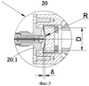 Лазерный резонатор первого излучателя (литотриптора) собран на базе активного элемента из кристалла Nd:YAlO3 27. Изменение эффективной длины резонатора выполнено за счет установки волоконной оптической задержки 21. Согласование апертуры излучения на выходном торце волокна оптической задержки 21 с апертурой активного элемента 27 выполняется объективом 22, фокусное расстояние которого в описываемом конкретном случае выбиралось равным 18 мм. Возврат излучения, вышедшего из противоположного торца оптической задержки 21, осуществляется сферическим зеркалом 20. В описываемом предпочтительно случае осуществления изобретения торец волокна (с диаметром кварцевой жилы d=300 мкм) предпочтительно расположен на малом расстоянии от отражающей поверхности зеркала 20, равном диаметру кварцевой жилы волокна: d . Радиус R сферической поверхности зеркала 20 выбран таким, чтобы R>>d, а выбор конкретного значения радиуса R определяется конструкцией узла крепления зеркала. Как показано на фиг.3, деталь 20.1 разъема волокна лежит на сферической поверхности зеркала и имеет диаметр D. Значения D и R определяют зазор , между отражающей поверхностью зеркала 20 и торцом волокна. Размер отражающего покрытия на зеркале 20 должен быть меньше D, внутреннего диаметра детали 20.1, чтобы предотвратить загрязнение или повреждение при сборке узла. При значениях D=8,6±0,1 мм и R=36 мм зазор между торцом волокна и отражающей поверхностью волокна составляет =257±7 мкм. Экспериментально определено, что при указанном значении , волокне типа кварц/кварц, с диаметром жилы 300 мкм, длине волокна 70 м и длине волны излучения 1,0796 мкм – числовая апертура излучения, выходящая из торца волокна в сторону активного элемента 27, по уровню 96% от полной энергии излучения равна NA=0,16. Радиус изгиба волокна, свернутого в кольца, равен 150 мм. Если в фокальной плоскости объектива 22 установить диафрагму 23 диаметром, соответствующим такой же числовой апертуре NA=0,16, она, в свою очередь, будет отсекать излучение с большими углами, распространяющееся в резонаторе в сторону оптической задержки. Узел сферического зеркала 20 может служить своеобразным селектором углов за счет увеличения потерь для излучения, имеющего большие значения числовой апертуры при возврате в оптическую задержку.