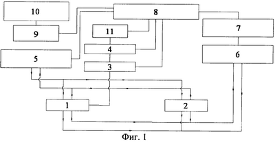 Как показано на блок-схеме, на фиг.1, установка по изобретению состоит из двух лазерных излучателей с активными элементами из кристаллов Nd:YAlO3 1 и Nd:YAG 2. Накачка активных элементов 1 и 2 осуществляется блоком питания ламп накачки 5, управляемым контроллером 8. Модуляция добротности резонатора в первом излучателе (в литотрипторе) осуществляется модулятором 3 на основе затвора с нарушенным полным внутренним отражением (затвор НПВО), блок управления которого связан с контроллером 8. Внерезонаторное преобразование излучения литотриптора во вторую гармонику осуществляется нелинейным кристаллом, находящимся в термостате 4. Система охлаждения 6 с воздушно-водяным теплообменником замкнутого цикла осуществляет охлаждение активных элементов 1 и 2 и ламп накачки. Измерение и контроль выходных параметров излучения производится с помощью группы компонентов 11, на основе фотодиодов. Присутствующий в показанном на фиг.1 примере сенсорный монитор 9 служит как в качестве контрольной панели для управления пользователем работой установки, так и в качестве видеомонитора для отображения сигнала эндовидеокамеры, обработка которого осуществляется блоком обработки 10. Блок обработки видеосигнала 10 может служить не только для отображения хода вмешательства в реальном времени на экране монитора 9, но и может производить запись видеосигнала на внешний мобильный носитель данных (например, на портативный жесткий диск, подключаемый с использованием USB-интерфейса), для архивирования или последующего анализа.