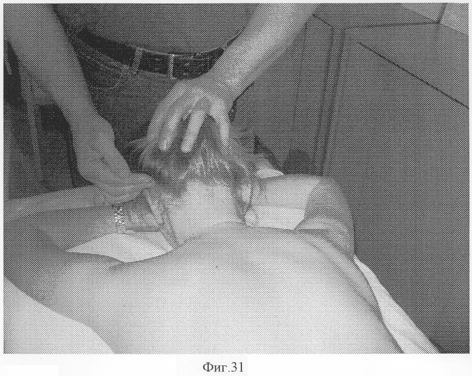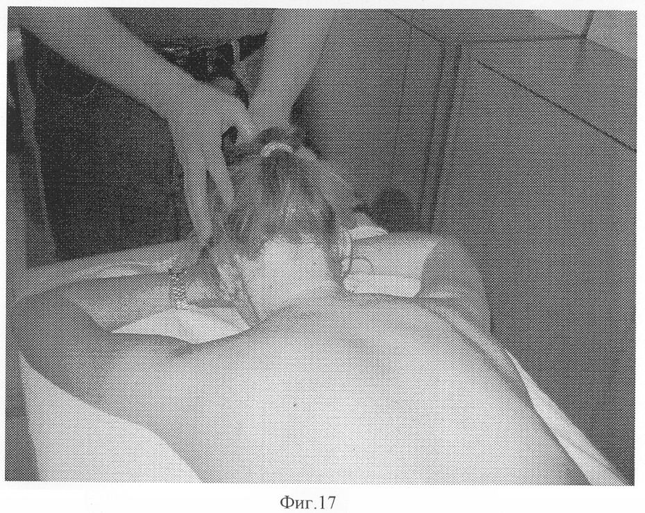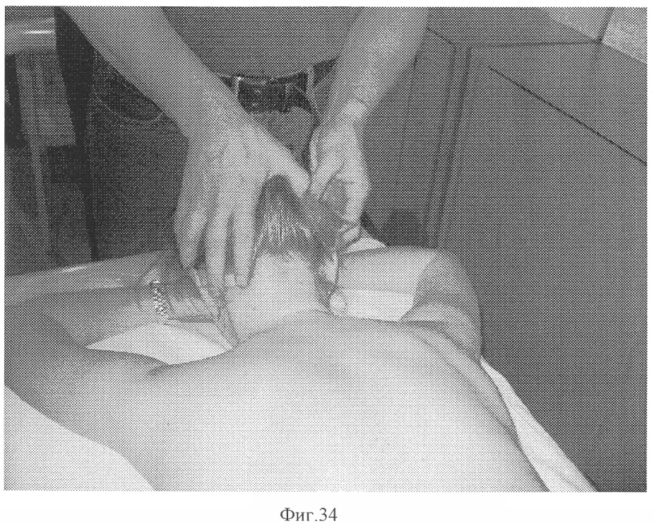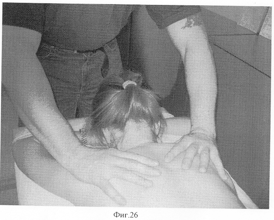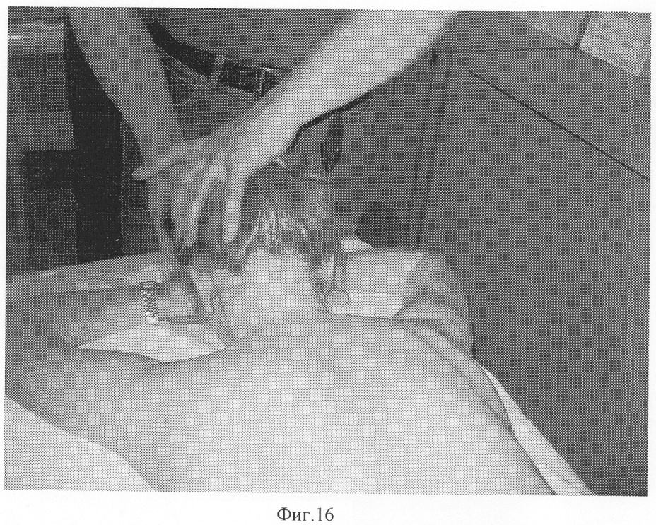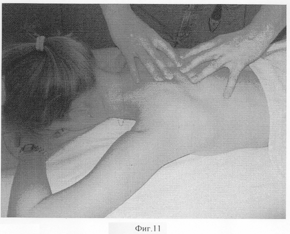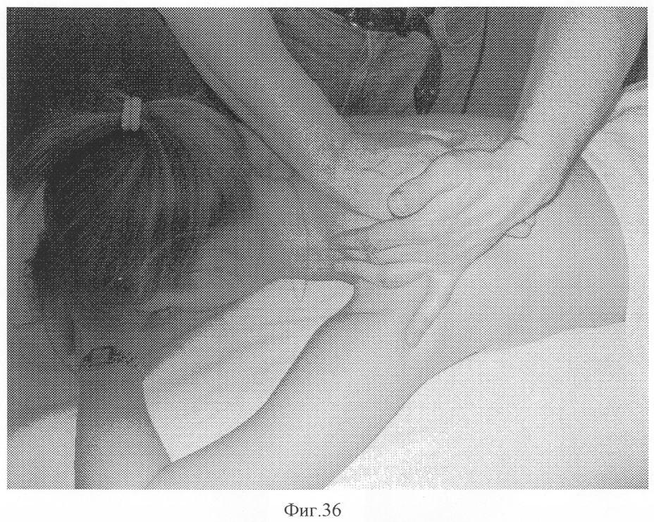 После этого движения переходят к проработке паравертебральных мышц и спиноцилиарного центра. Начинают движение с интенсивного граблеобразного поглаживания кончиками пальцев всей поверхности спины, с акцентом на паравертебральных мышцах и спиноцилиарном центре 2-3 мин (фиг.11). Далее следует переход трапециевидные мышцы и их интенсивная вибрационная проработка в течение 30-40 секунд (фиг.12), после чего начинают стимуляцию точек выхода затылочного нерва, которая начинается с поглаживания ладонной поверхностью левой руки и одновременной вибрационной стимуляцией кончиками пальцев левой руки 15-20 секунд (фиг.13). Не прекращая стимуляцию левой рукой, правой проводят обхватывающее поглаживание ладонной поверхностью и предплечьем 1-2 мин (фиг.14), сменяемое стимуляцией кончиками пальцев уже обеих рук 2-3 мин (фиг.15, 16, 17, 18, 19), после чего следуют глубокие релаксирующие движения 40-60 секунд (фиг.20, 21, 22) с переходом на шею и спину 1-2 мин (фиг.23, 24, 25, 26), и вновь следует вибрационная стимуляция затылочных нервов 10-15 секунд (фиг.27, 28), чередующаяся с релаксирующими движениями 5 секунд (фиг.29). Далее следует проработка пульсирующими движениями мышц шеи с обеих сторон 1 мин (фиг.30), переходящая в пульсирующую стимуляцию черепных нервов 10-15 секунд (фиг.31, 32), чередующаяся с плавными релаксирующими движениями 15-20 секунд (фиг.33, 34, 35).