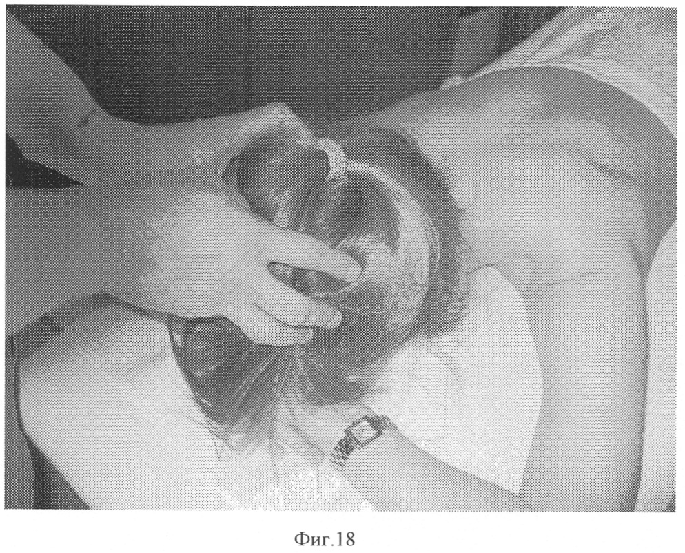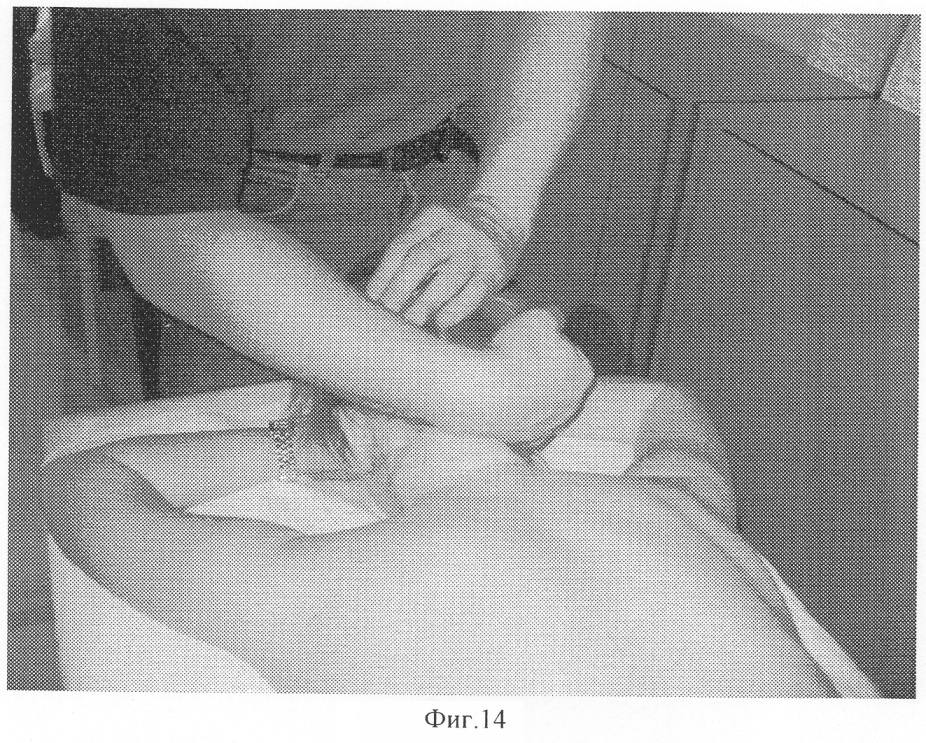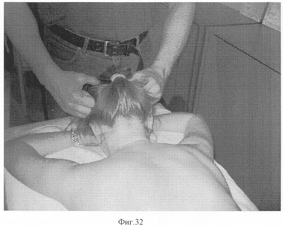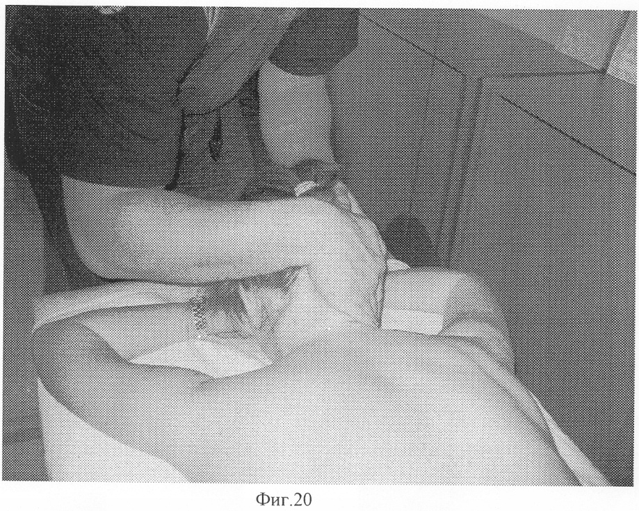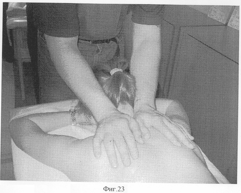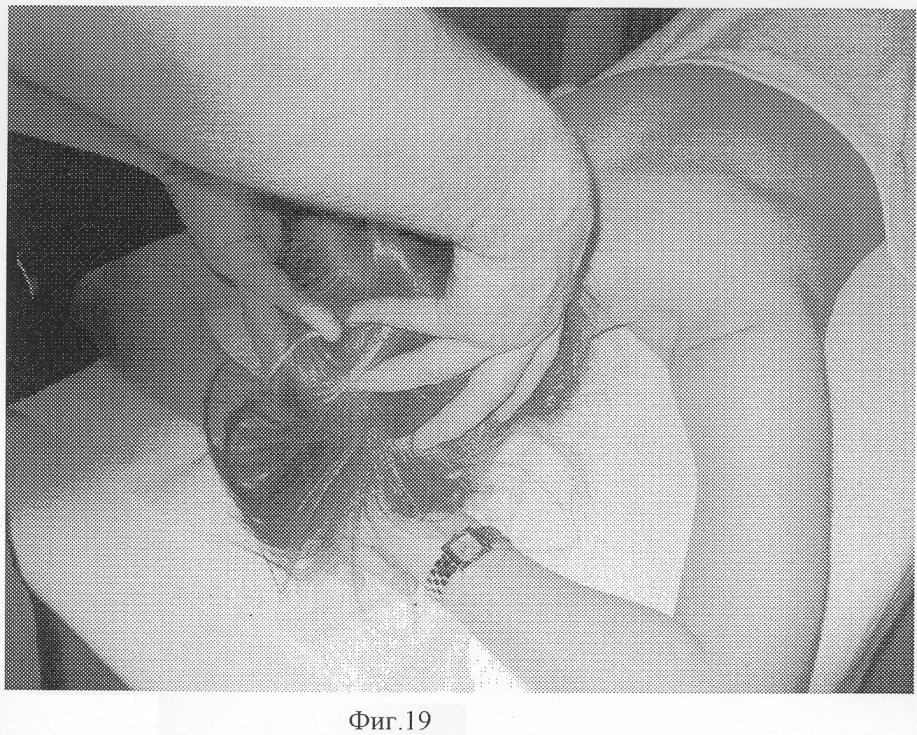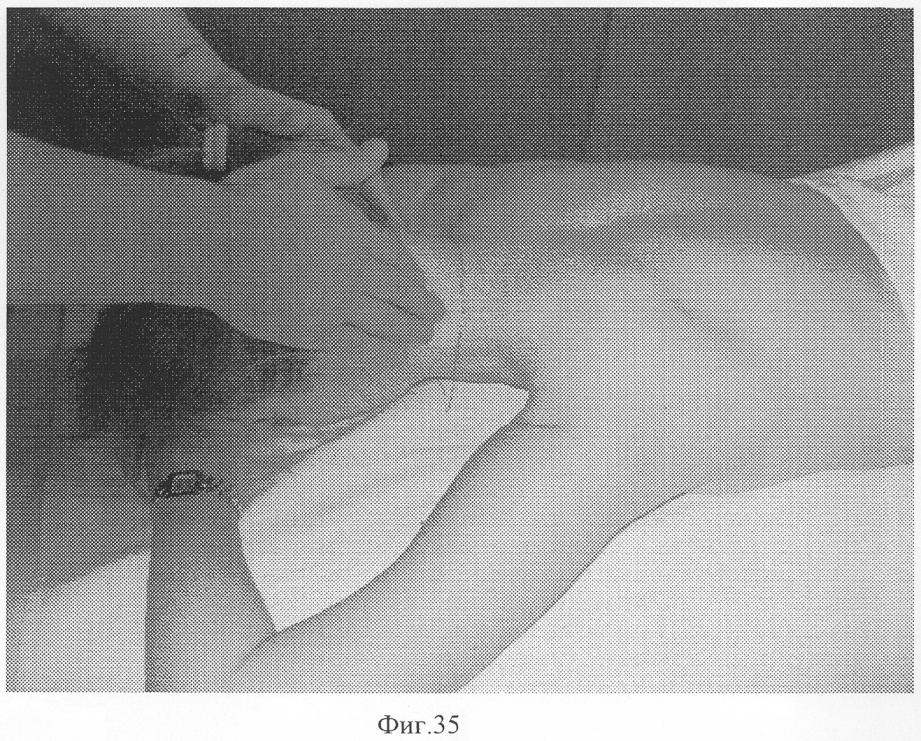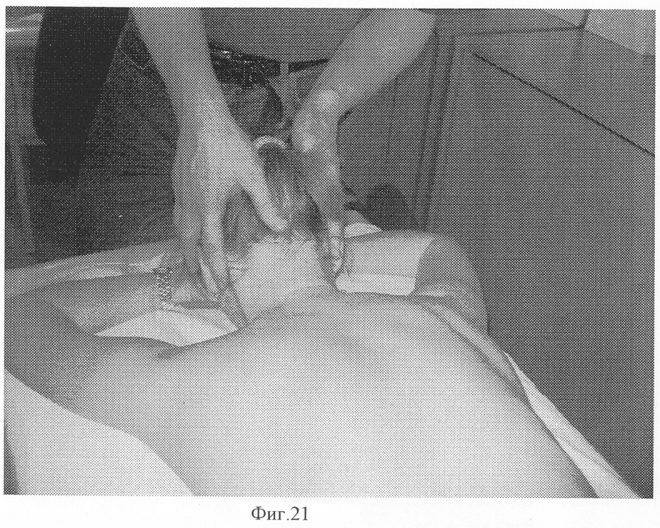 После этого движения переходят к проработке паравертебральных мышц и спиноцилиарного центра. Начинают движение с интенсивного граблеобразного поглаживания кончиками пальцев всей поверхности спины, с акцентом на паравертебральных мышцах и спиноцилиарном центре 2-3 мин (фиг.11). Далее следует переход трапециевидные мышцы и их интенсивная вибрационная проработка в течение 30-40 секунд (фиг.12), после чего начинают стимуляцию точек выхода затылочного нерва, которая начинается с поглаживания ладонной поверхностью левой руки и одновременной вибрационной стимуляцией кончиками пальцев левой руки 15-20 секунд (фиг.13). Не прекращая стимуляцию левой рукой, правой проводят обхватывающее поглаживание ладонной поверхностью и предплечьем 1-2 мин (фиг.14), сменяемое стимуляцией кончиками пальцев уже обеих рук 2-3 мин (фиг.15, 16, 17, 18, 19), после чего следуют глубокие релаксирующие движения 40-60 секунд (фиг.20, 21, 22) с переходом на шею и спину 1-2 мин (фиг.23, 24, 25, 26), и вновь следует вибрационная стимуляция затылочных нервов 10-15 секунд (фиг.27, 28), чередующаяся с релаксирующими движениями 5 секунд (фиг.29). Далее следует проработка пульсирующими движениями мышц шеи с обеих сторон 1 мин (фиг.30), переходящая в пульсирующую стимуляцию черепных нервов 10-15 секунд (фиг.31, 32), чередующаяся с плавными релаксирующими движениями 15-20 секунд (фиг.33, 34, 35).