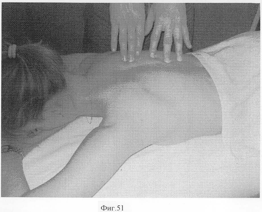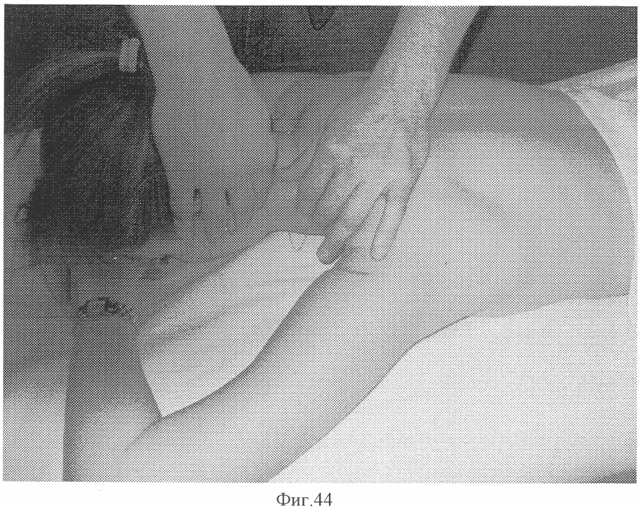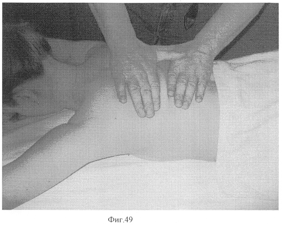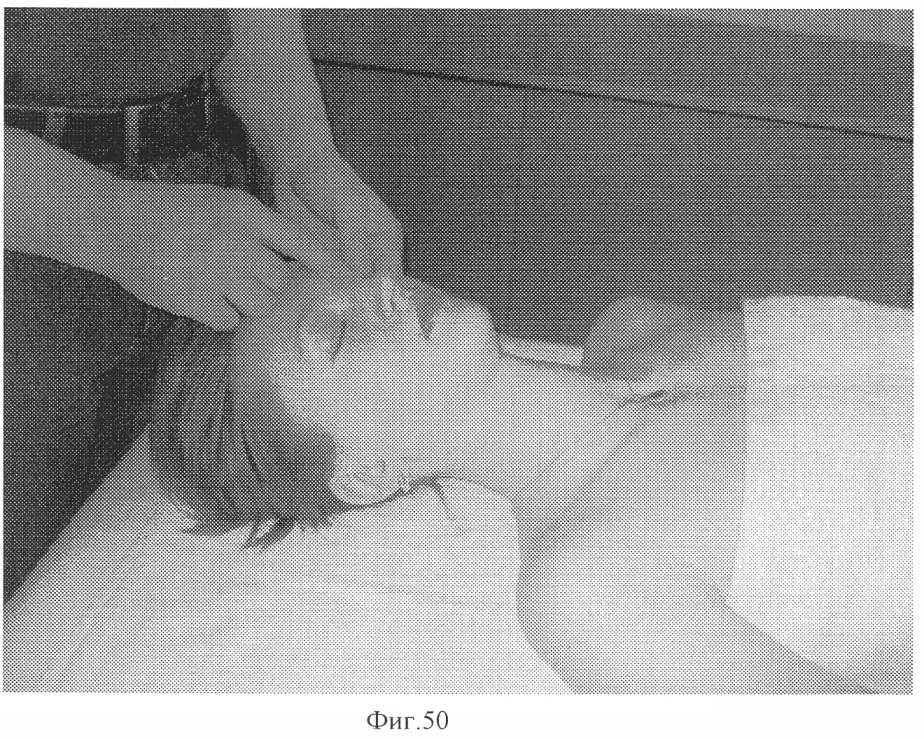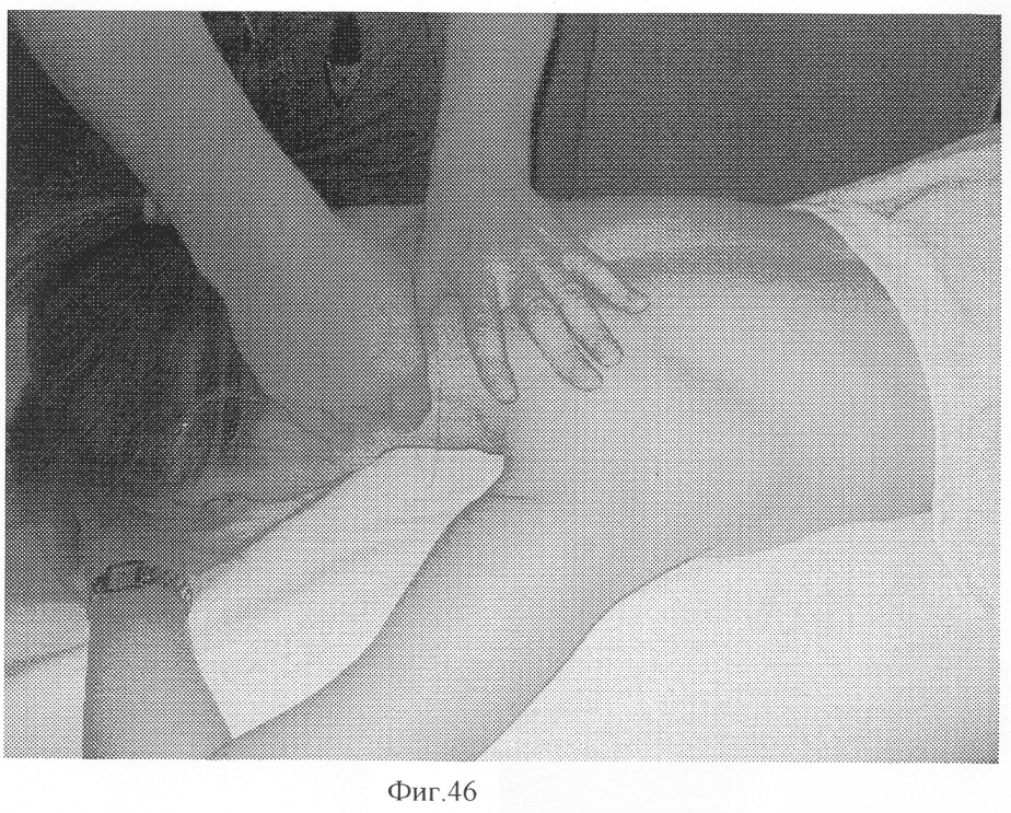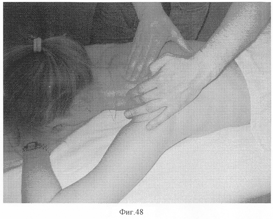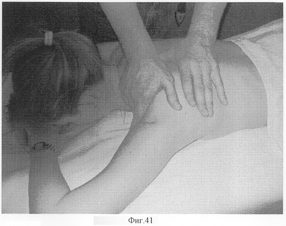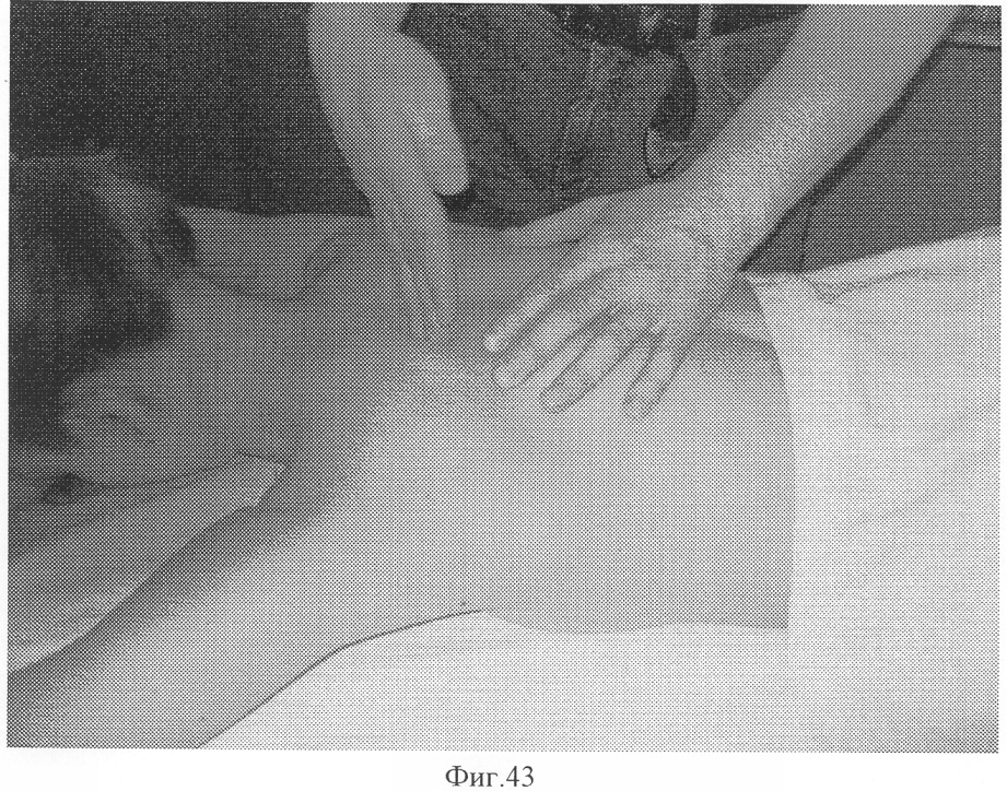 После этого выполняют обхватывающее поглаживание трапециевидной мышцы 10 секунд (фиг.41) с переходом на интенсивную вибрационную стимуляцию кончиками пальцев под различными углами паравертебральных мышц 5-10 секунд (фиг.42, 43), переходящее в плавное разминание трапециевидной мышцы, выполняемое сначала большими пальцами 5 секунд (фиг.45), затем указательным и безымянным 5 секунд (фиг.46) и указательным и средним навстречу друг другу 5 секунд (фиг.47, 48). Далее следует сильное пересекающее разминание всей спины ладонной поверхностью 2-3 мин (фиг.49).