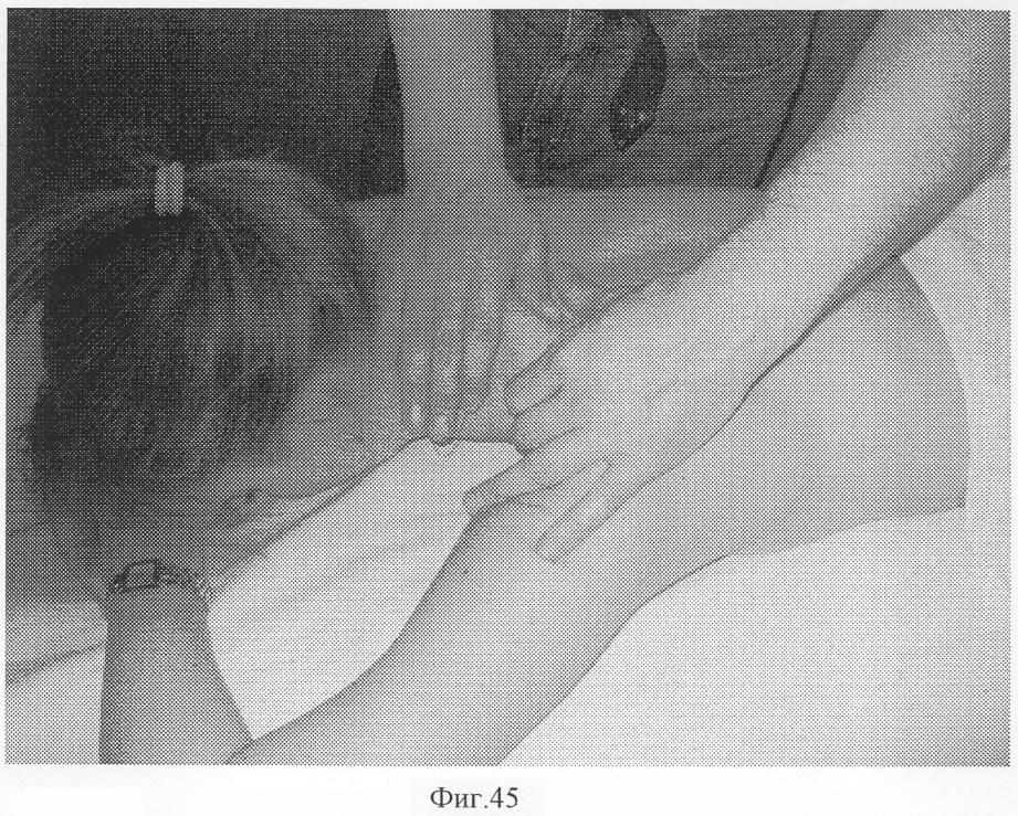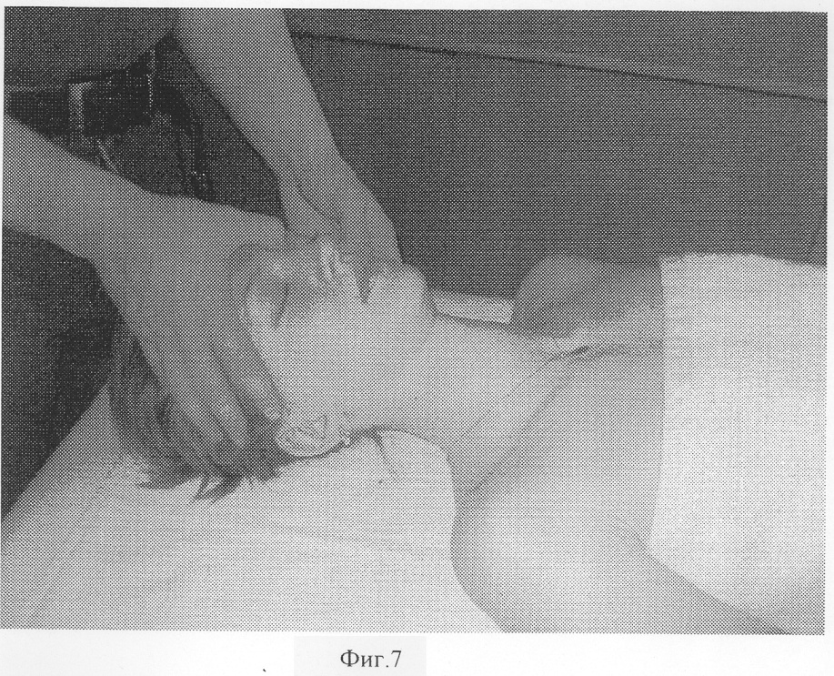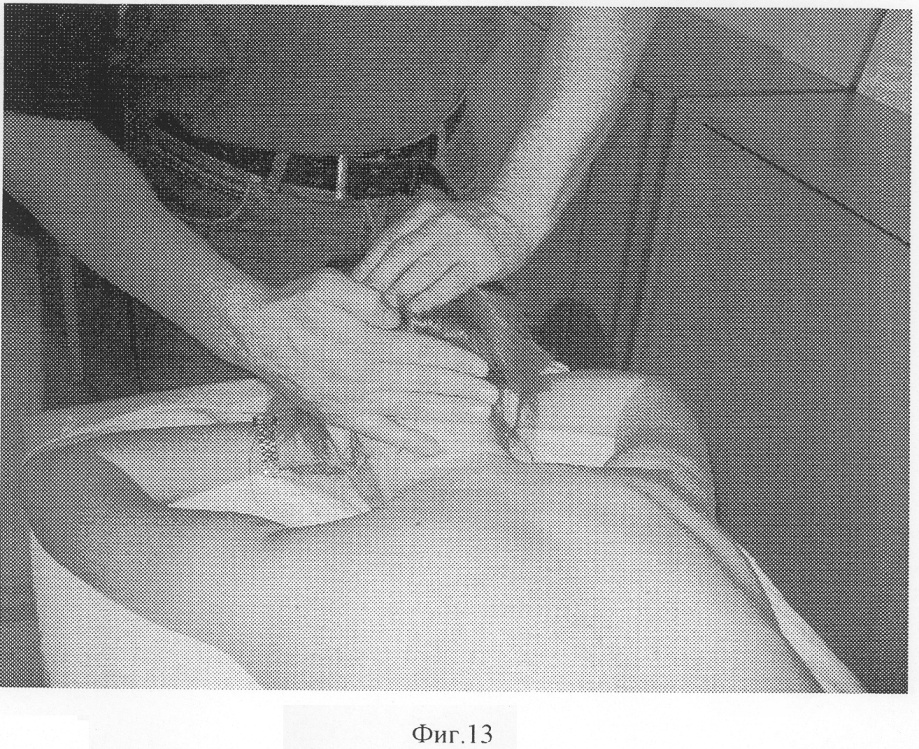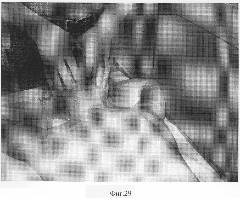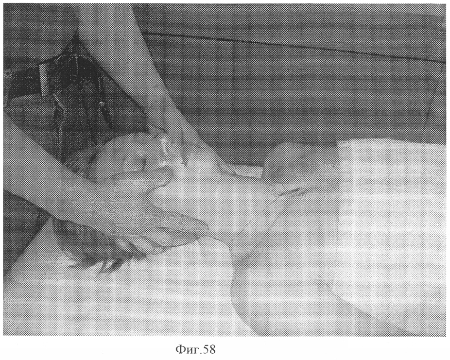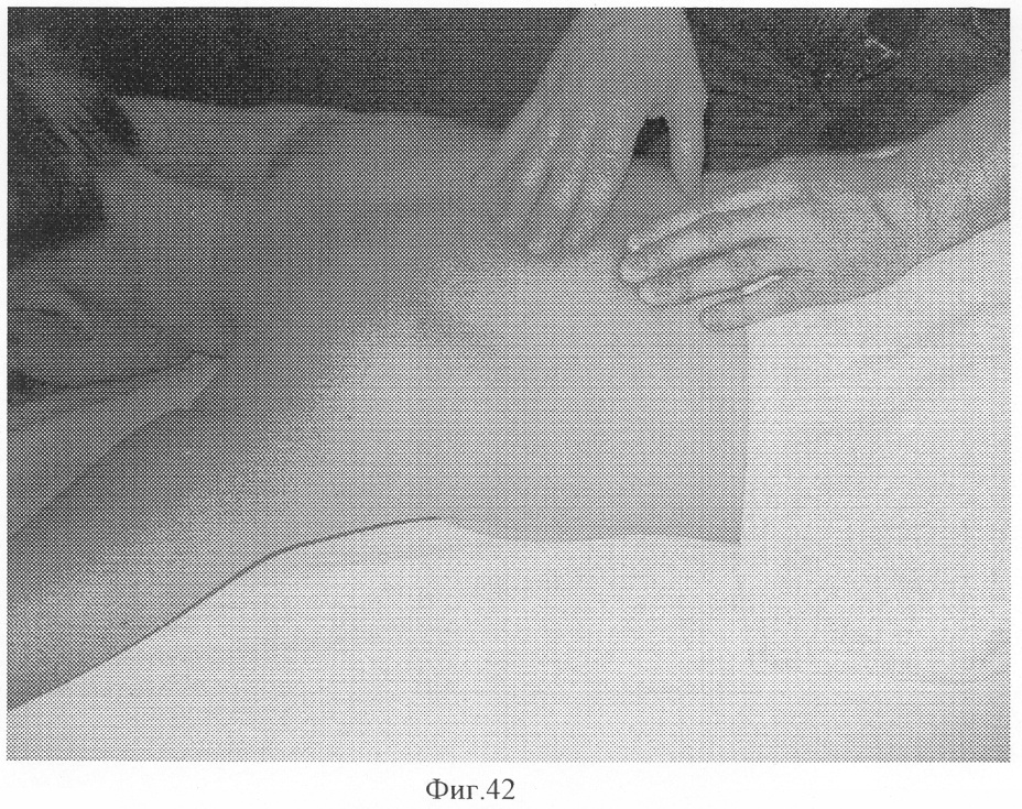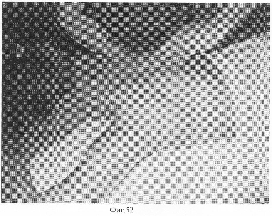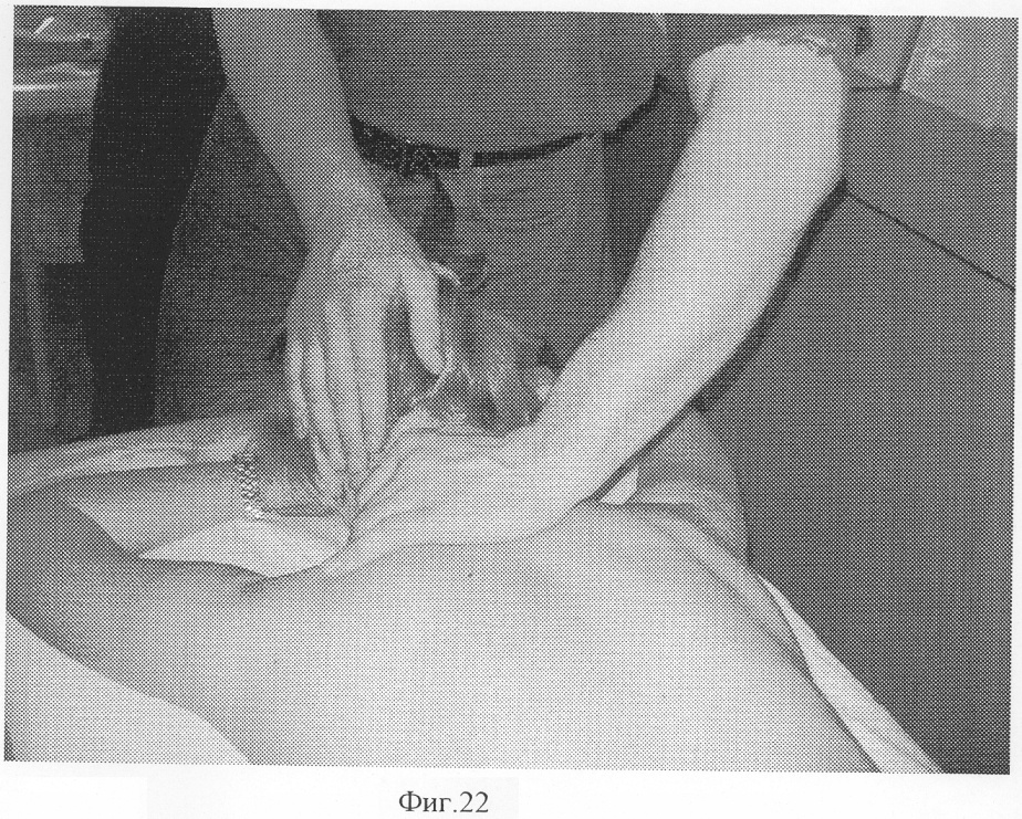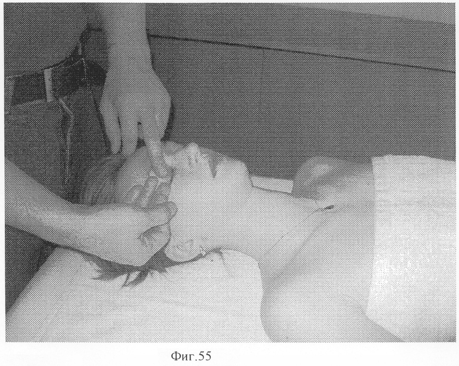 После этого выполняют обхватывающее поглаживание трапециевидной мышцы 10 секунд (фиг.41) с переходом на интенсивную вибрационную стимуляцию кончиками пальцев под различными углами паравертебральных мышц 5-10 секунд (фиг.42, 43), переходящее в плавное разминание трапециевидной мышцы, выполняемое сначала большими пальцами 5 секунд (фиг.45), затем указательным и безымянным 5 секунд (фиг.46) и указательным и средним навстречу друг другу 5 секунд (фиг.47, 48). Далее следует сильное пересекающее разминание всей спины ладонной поверхностью 2-3 мин (фиг.49).