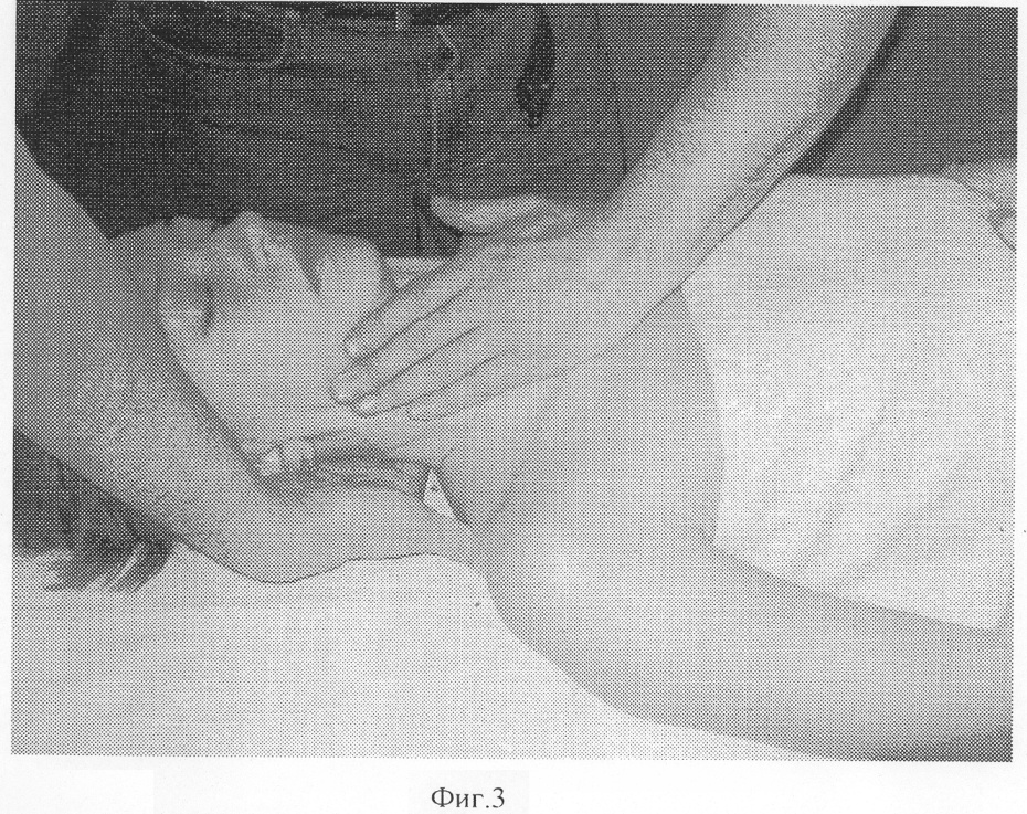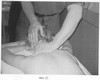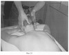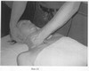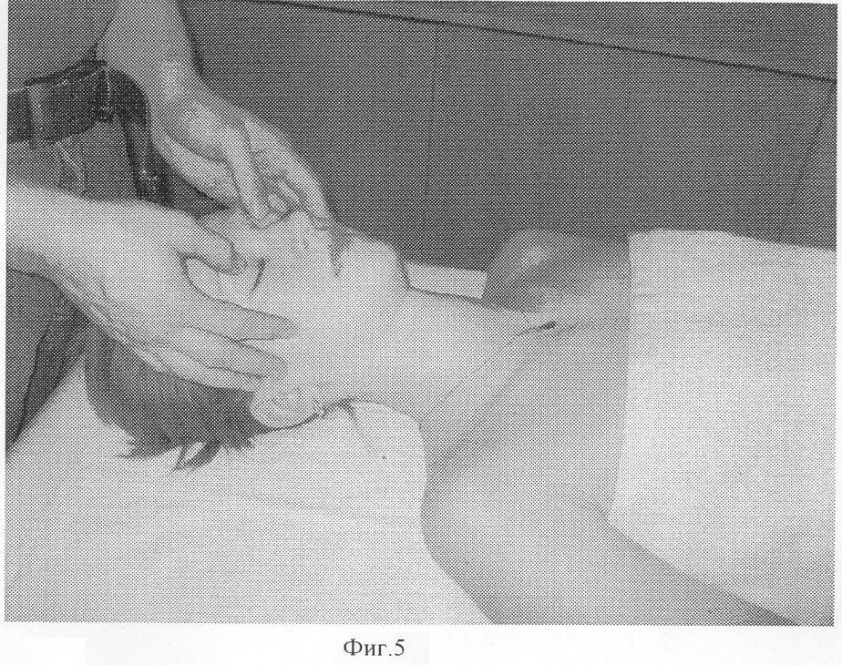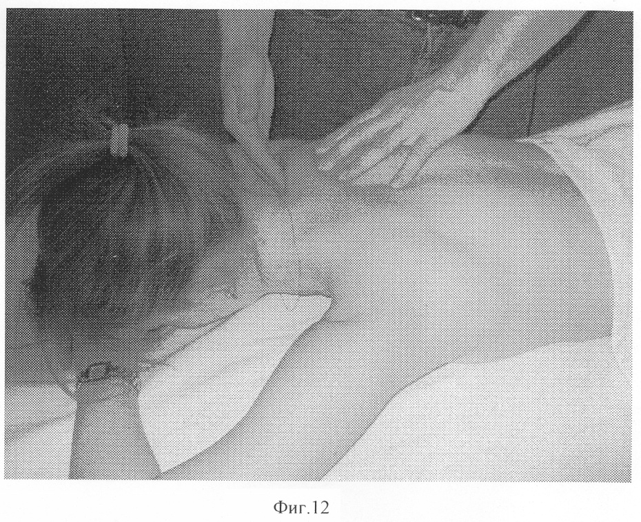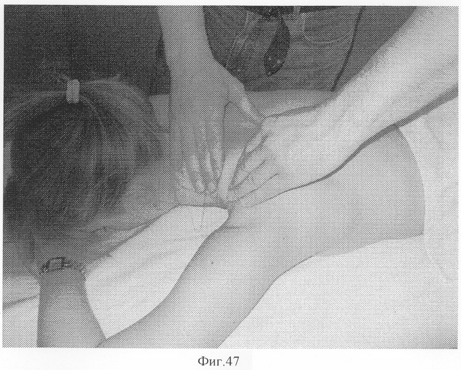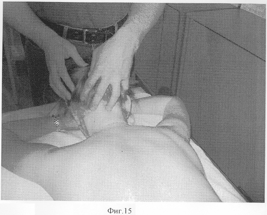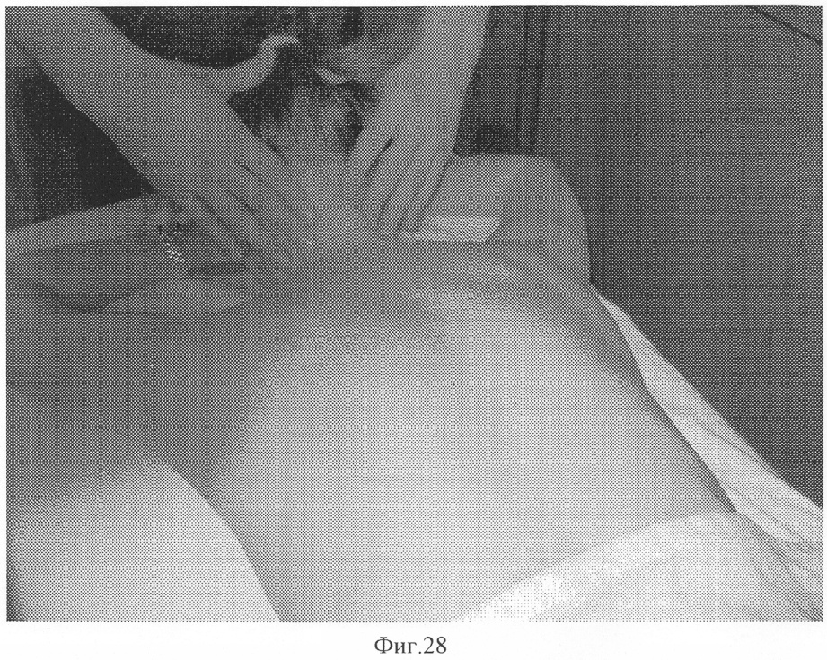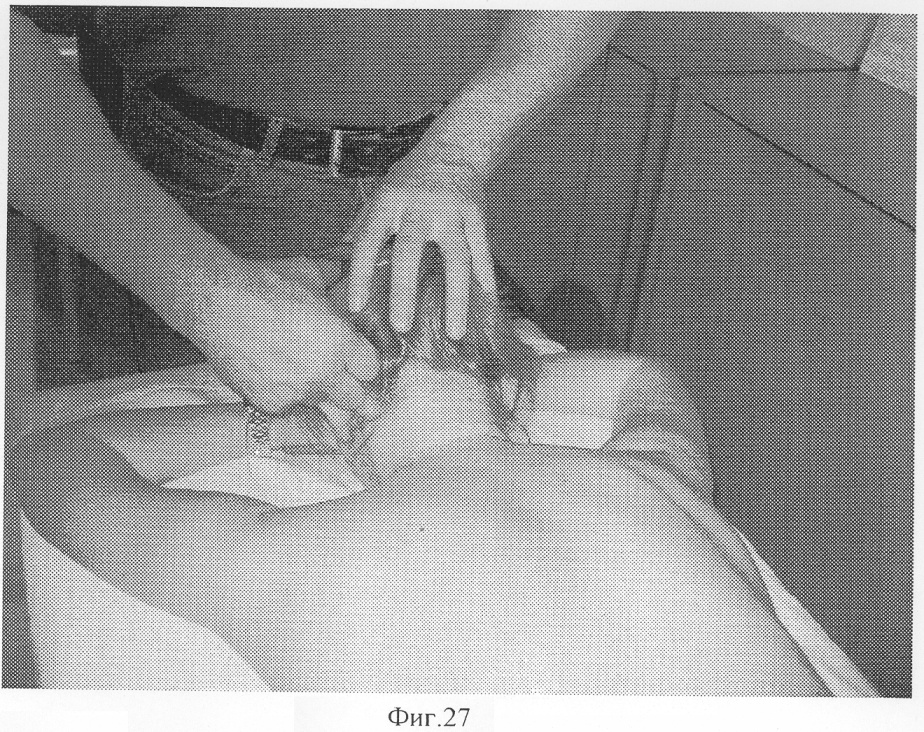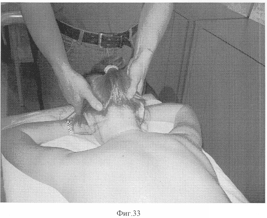 После этого выполняют обхватывающее поглаживание трапециевидной мышцы 10 секунд (фиг.41) с переходом на интенсивную вибрационную стимуляцию кончиками пальцев под различными углами паравертебральных мышц 5-10 секунд (фиг.42, 43), переходящее в плавное разминание трапециевидной мышцы, выполняемое сначала большими пальцами 5 секунд (фиг.45), затем указательным и безымянным 5 секунд (фиг.46) и указательным и средним навстречу друг другу 5 секунд (фиг.47, 48). Далее следует сильное пересекающее разминание всей спины ладонной поверхностью 2-3 мин (фиг.49).