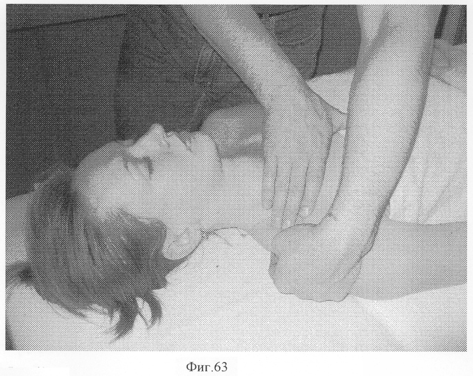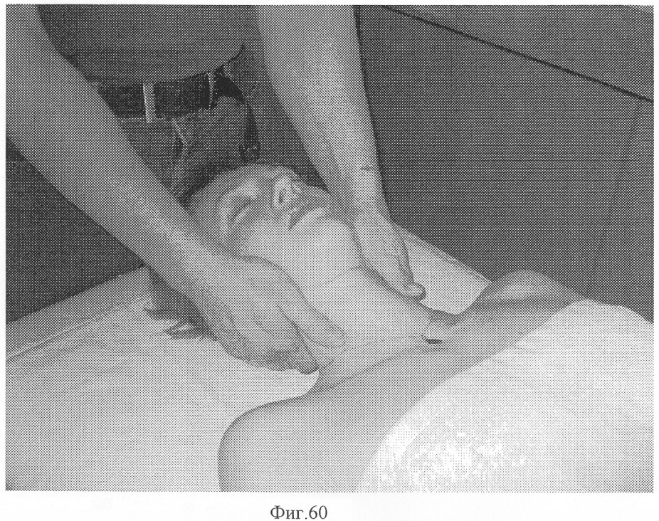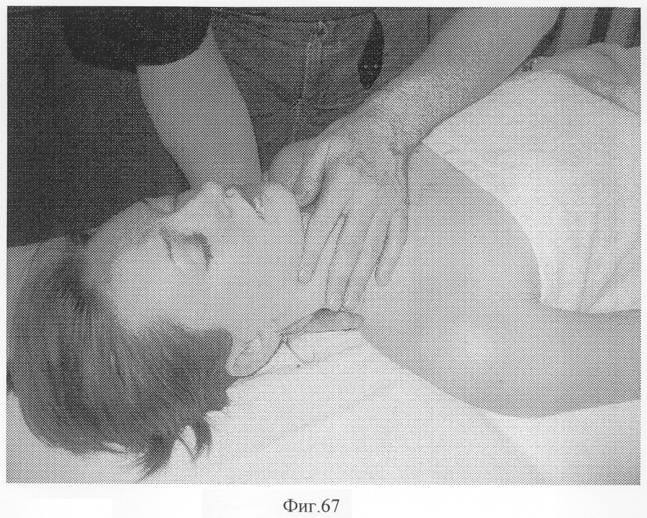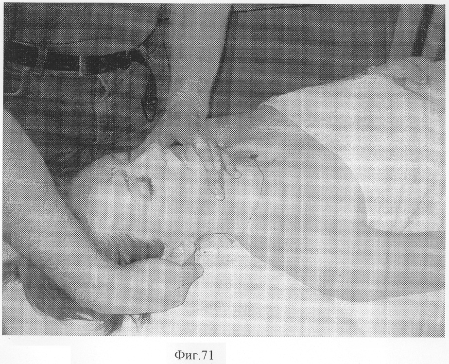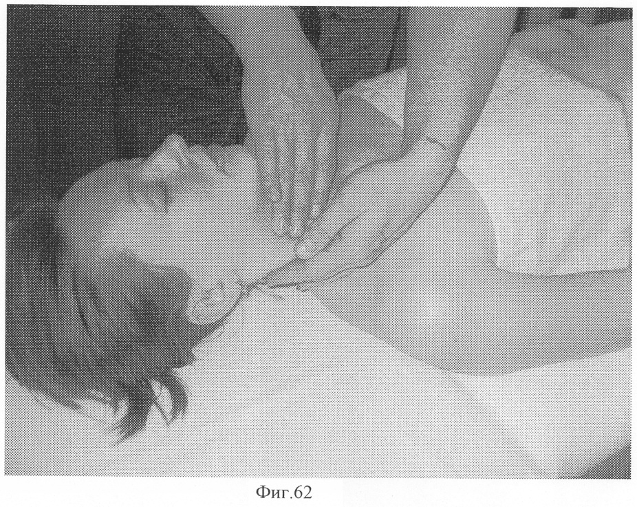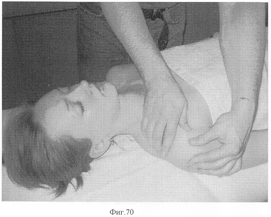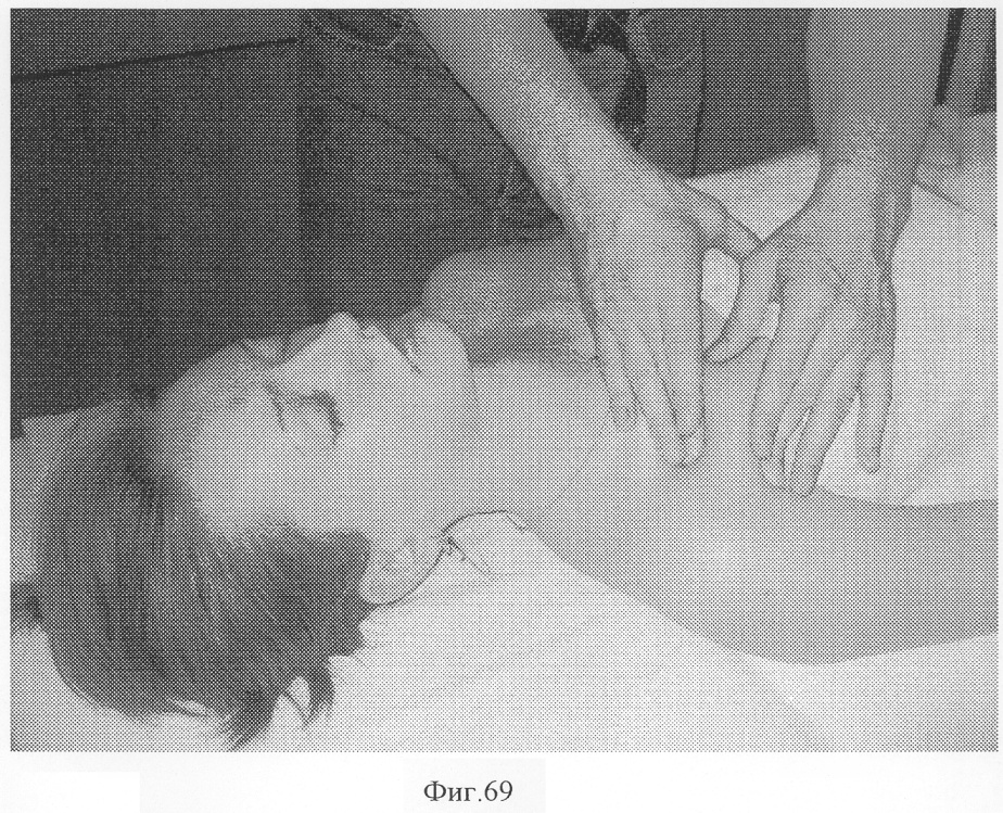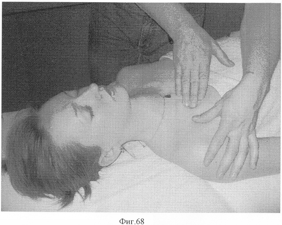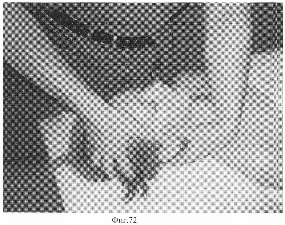 Далее приступают к частому, интенсивному разминанию грудинно-ключично-сосцевидной мышцы, вначале захватыванием между большим и остальными пальцами 15-20 секунд (фиг.61), а после этого вибрирующими движениями кончиками пальцев правой руки, придерживая мышцу левой рукой (фиг.62), попеременно на каждой стороне по 20-30 секунд, после чего переходим к разминанию трапециевидной мышцы вибрирующими движениями кончиками пальцев правой руки, придерживая мышцу левой рукой (фиг.63), попеременно с обеих сторон, меняя руки, (фиг.64), через 15-20 секунд по 3-4 раза. Это движение сменяется разминанием трапециевидной мышцы пальцами обеих рук, причем одной рукой фиксируют шею и между пальцами трапециевидную мышцу, а другой производят разминание мышцы между пальцами 20-30 секунд (фиг.65, 66). Далее выполняют обхватывающее поглаживание задней стороны шеи 10 секунд (фиг.67), и переходят к разминанию большой грудной мышцы медленными движениями ладонной поверхности левой руки 40-60 секунд (фиг.68, 69), завершающееся обхватывающим поглаживанием 10 секунд (фиг.70).