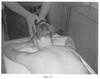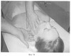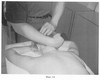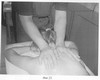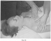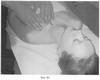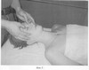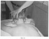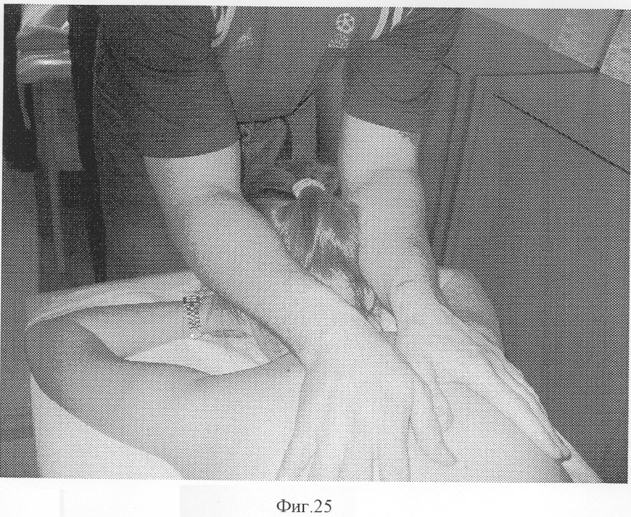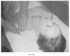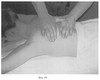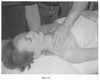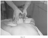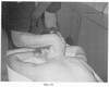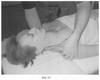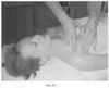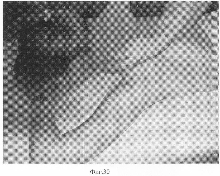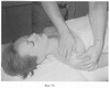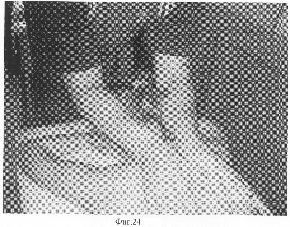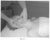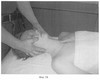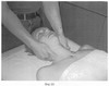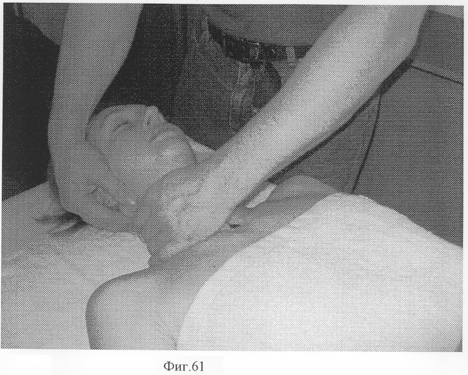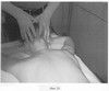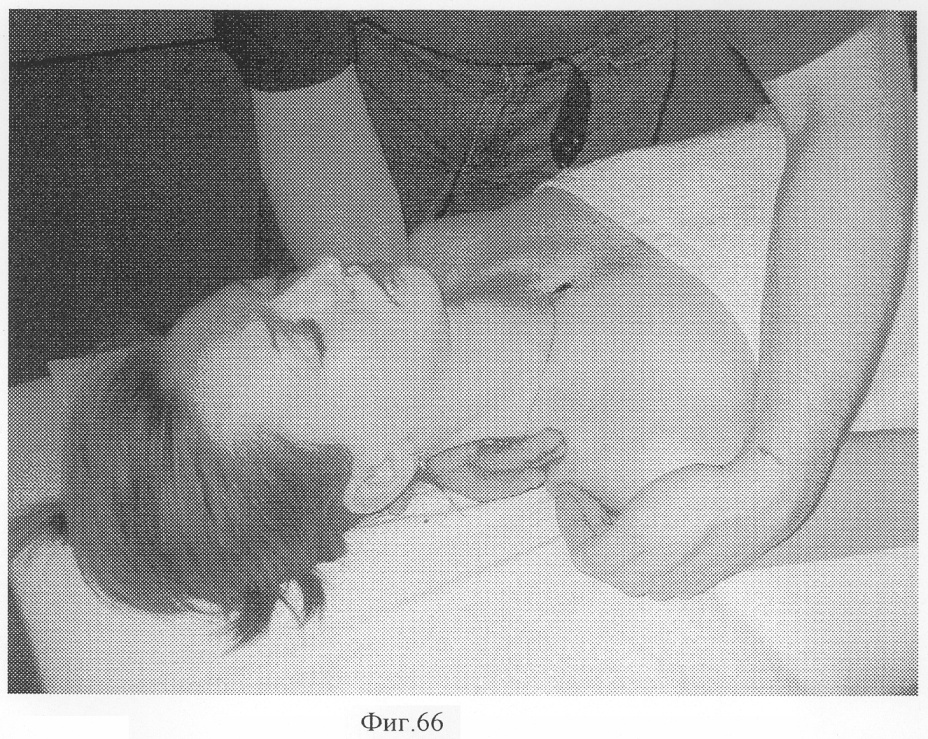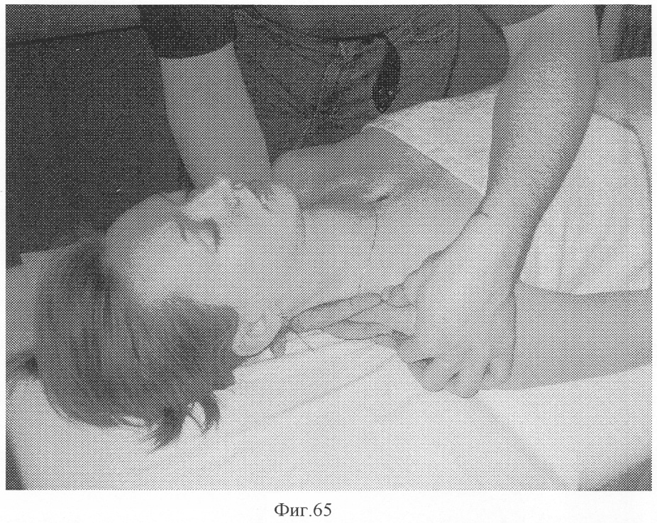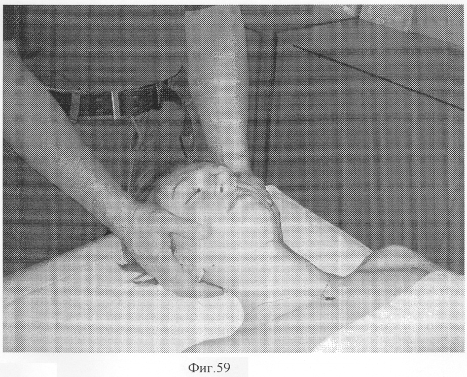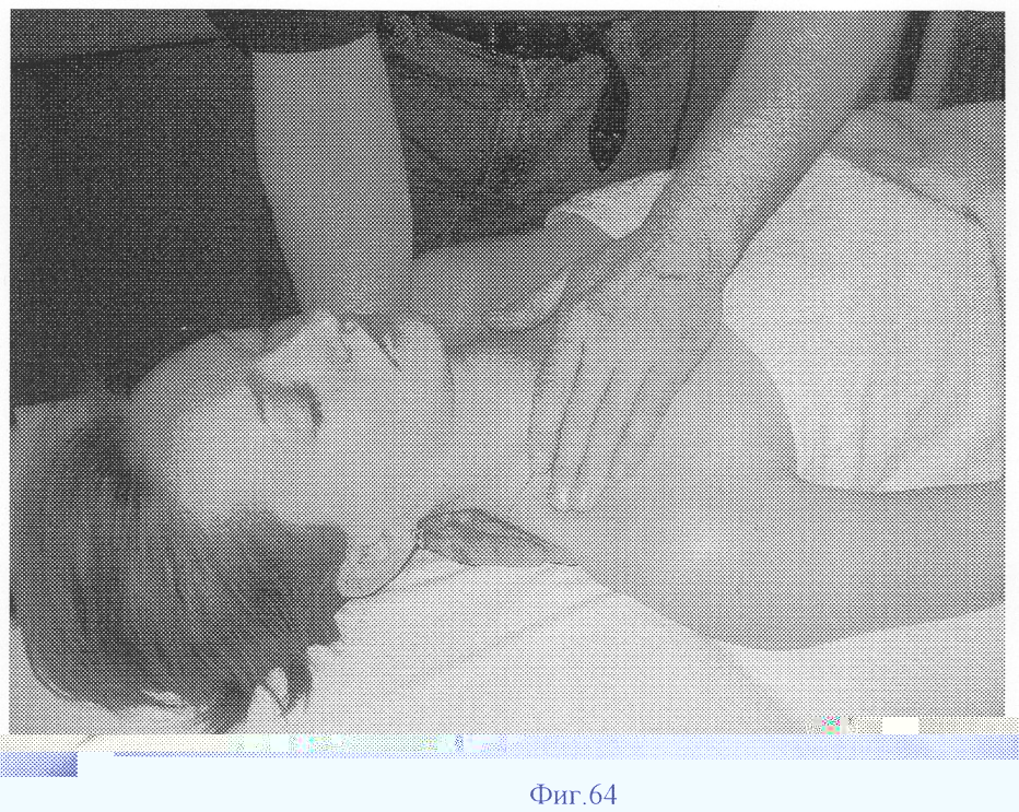 Далее приступают к частому, интенсивному разминанию грудинно-ключично-сосцевидной мышцы, вначале захватыванием между большим и остальными пальцами 15-20 секунд (фиг.61), а после этого вибрирующими движениями кончиками пальцев правой руки, придерживая мышцу левой рукой (фиг.62), попеременно на каждой стороне по 20-30 секунд, после чего переходим к разминанию трапециевидной мышцы вибрирующими движениями кончиками пальцев правой руки, придерживая мышцу левой рукой (фиг.63), попеременно с обеих сторон, меняя руки, (фиг.64), через 15-20 секунд по 3-4 раза. Это движение сменяется разминанием трапециевидной мышцы пальцами обеих рук, причем одной рукой фиксируют шею и между пальцами трапециевидную мышцу, а другой производят разминание мышцы между пальцами 20-30 секунд (фиг.65, 66). Далее выполняют обхватывающее поглаживание задней стороны шеи 10 секунд (фиг.67), и переходят к разминанию большой грудной мышцы медленными движениями ладонной поверхности левой руки 40-60 секунд (фиг.68, 69), завершающееся обхватывающим поглаживанием 10 секунд (фиг.70).
