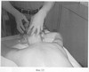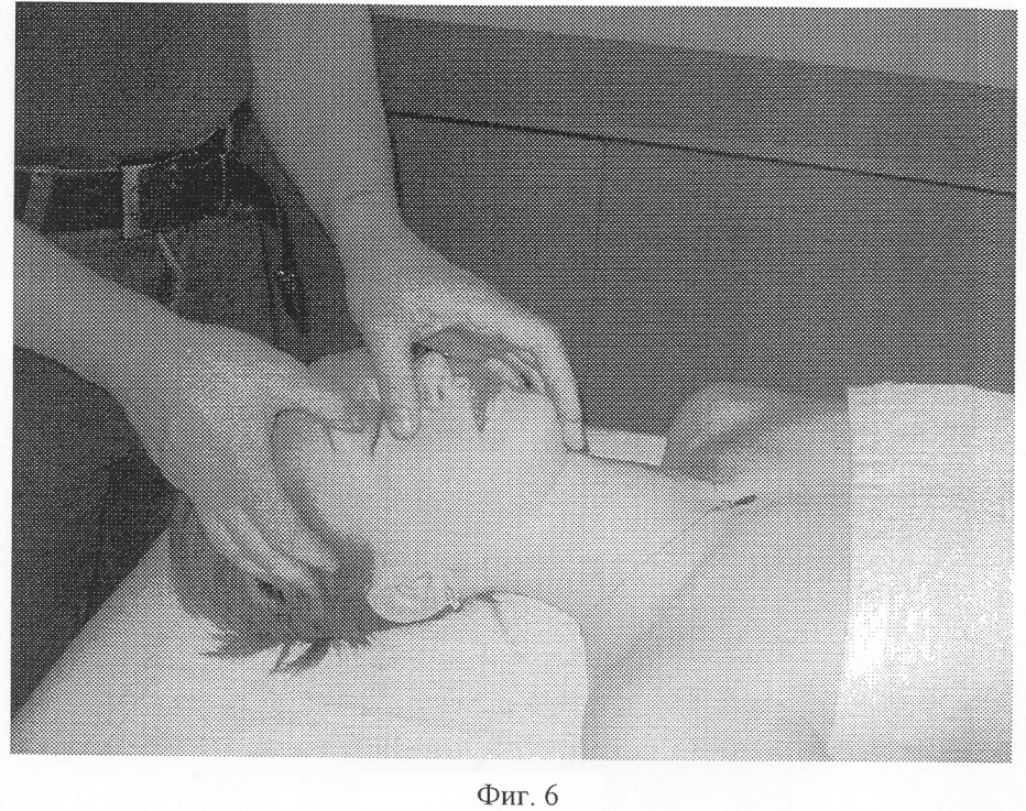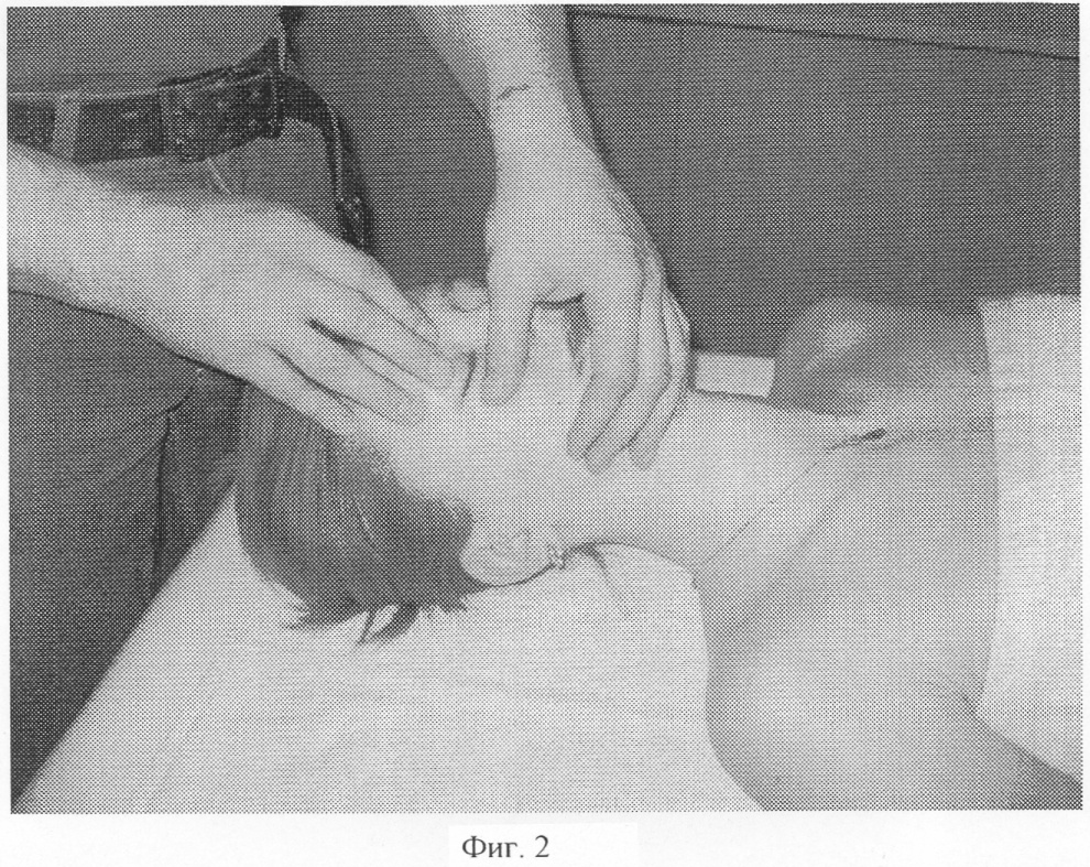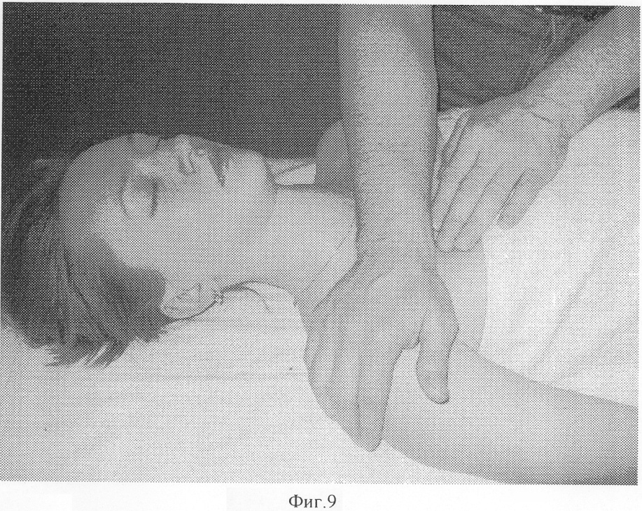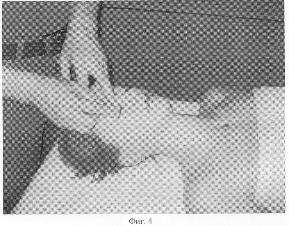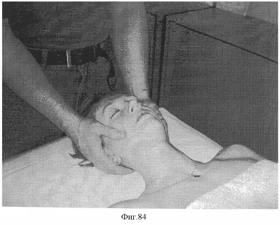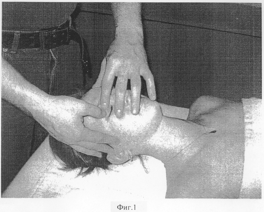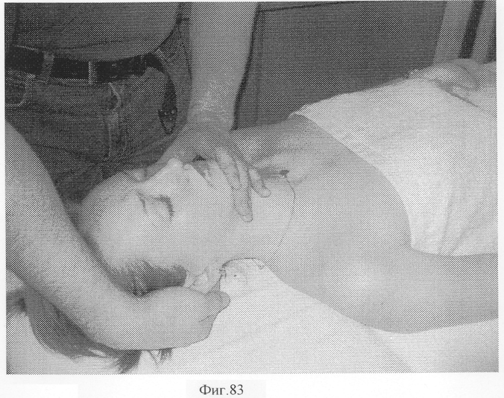 Способ осуществляют следующим образом. Выполнение способа иллюстрируется фиг.1-83. Начинают массаж с прямолинейного поглаживания кончиками пальцев всей поверхности лица (фиг.1) 20-30 секунд, затем прорабатывают большим пальцем правой руки и указательным и средним пальцами левой руки точки выхода тройничного нерва надглазничной и подглазничной области попеременно по 10 секунд с одной и с другой стороны лица (фиг.2) 4-6 раз. Затем выполняют поглаживающие движения боковой и задней поверхности шеи 15 секунд (фиг.3), после чего вновь возвращаются к прорабатыванию круговыми движениями точек выхода нервов в области глазницы на обеих сторонах лика попеременно 5-7 секунд (фиг.4, 5, 6, 7) 4-7 раз и переходят вначале к поглаживанию тыльной стороной и одновременной стимуляции кончиками пальцев большой грудной мышцы 25-30 секунд (фиг.8), с переходом на дельтовидную мышцу 15 секунд (фиг.9, 10).