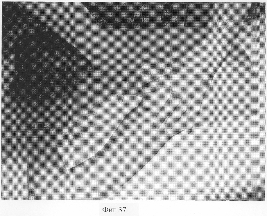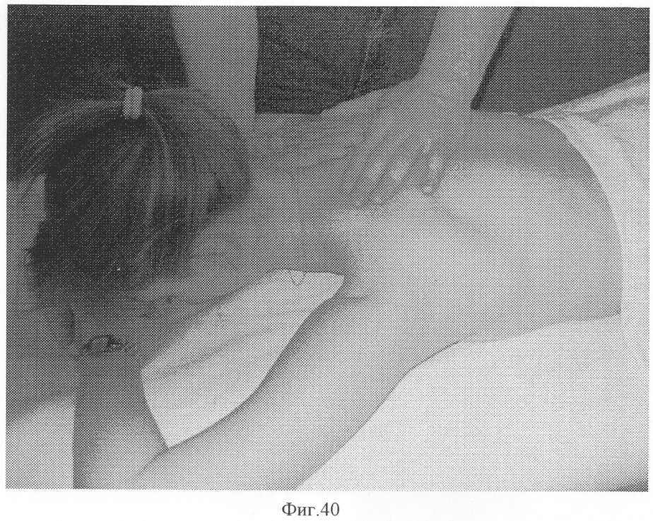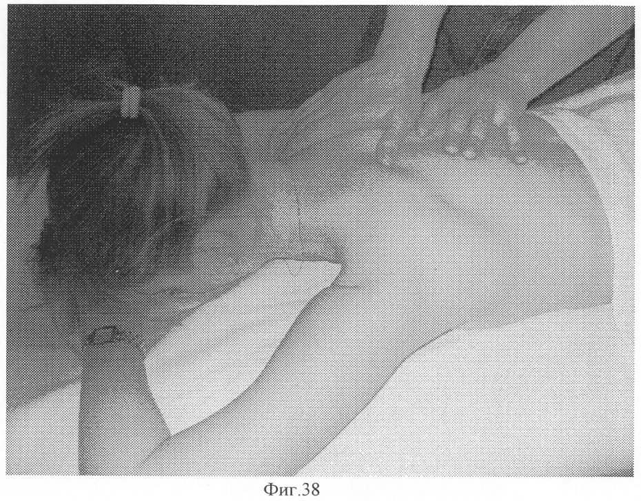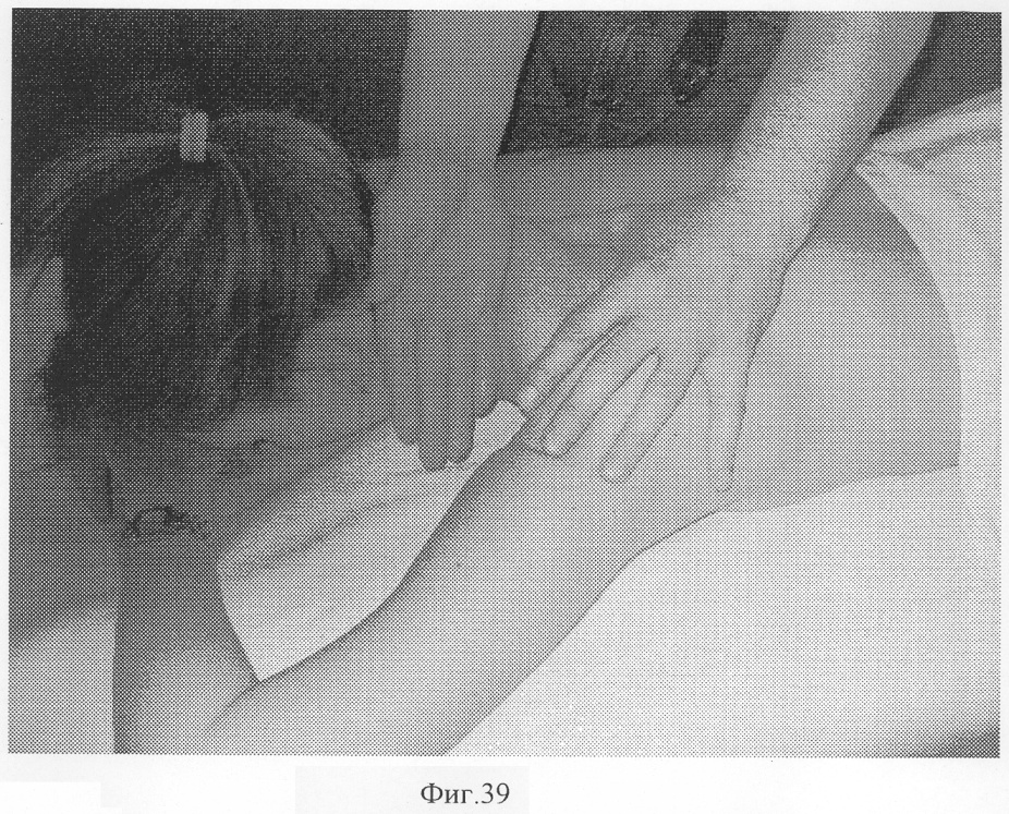 Далее переходят к прорабатыванию трапециевидных мышц. Правой рукой фиксируют мышцу, а левой выполняют частые вибрационные движения 5-7 секунд (фиг.36). После этого левой рукой фиксируют мышцу, а правой рукой, зажимая мышцу между указательным и средним пальцами, выполняют плавные поглаживания по ходу мышцы с обеих сторон по 15 секунд 3-4 раза (фиг.37). Следующее движение – вибрирующее воздействие ладонной поверхностью на трапециевидные мышцы с обеих сторон 2-3 раза по 10 секунд (фиг.38), которое переходит в глубокое релаксирующее поглаживание ребром ладони 2-3 секунды (фиг.39), после чего следует переход на другую сторону сильным поглаживающим движением тыльной стороной ладони (фиг.40) и вновь выполнение движений 36 и 37.