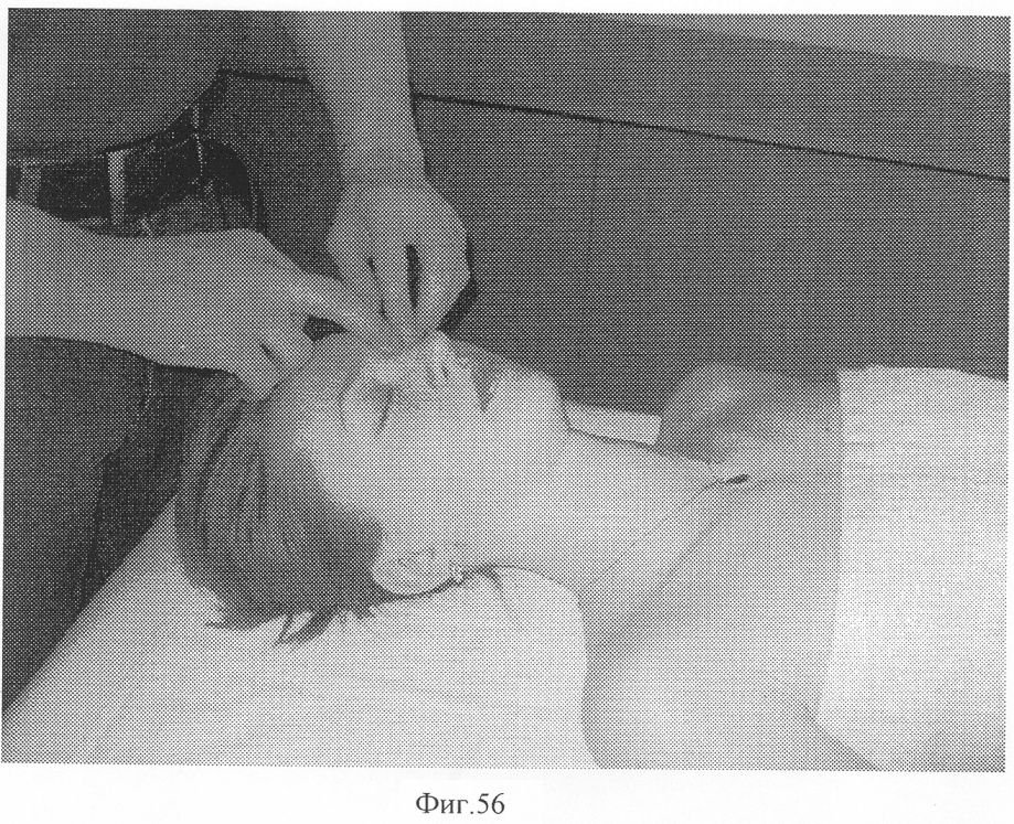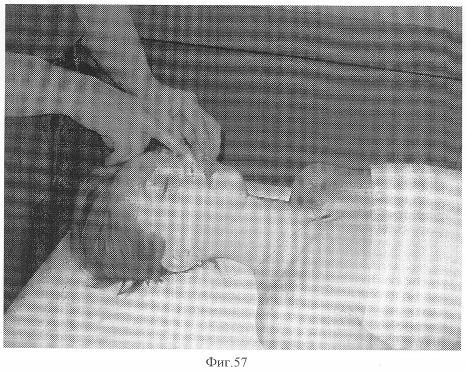 Далее вновь переходят к проработке точек выхода тройничного нерва. Вначале выполняют плавное круговое разминание большими пальцами (фиг.54). Через 5-10 секунд переходим к проработке надглазничного нерва кончиками пальцев и ногтевой пластиной с обеих сторон 10-15 секунд (фиг.55, 56), чередуя с проработкой подглазничного нерва 5-10 секунд 3-5 раз (фиг.57). После этого следуют плавные поглаживания затылочных нервов 10-15 секунд (фиг.58, 59) с переходом на расслабление мышц шеи 40-60 секунд (фиг.60).