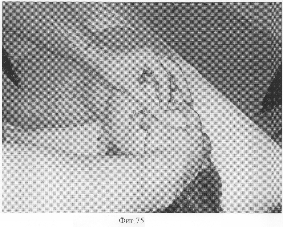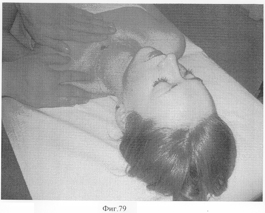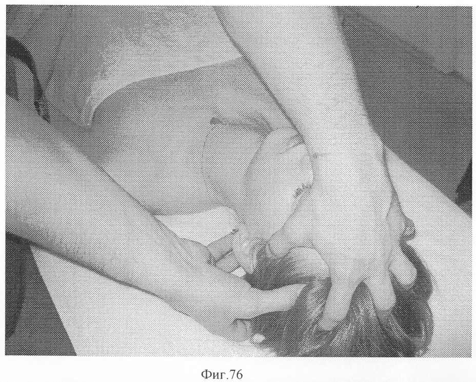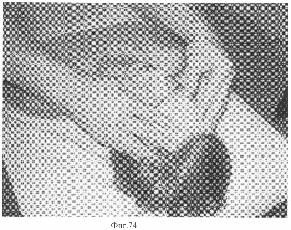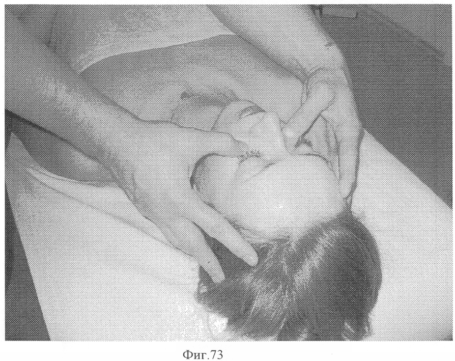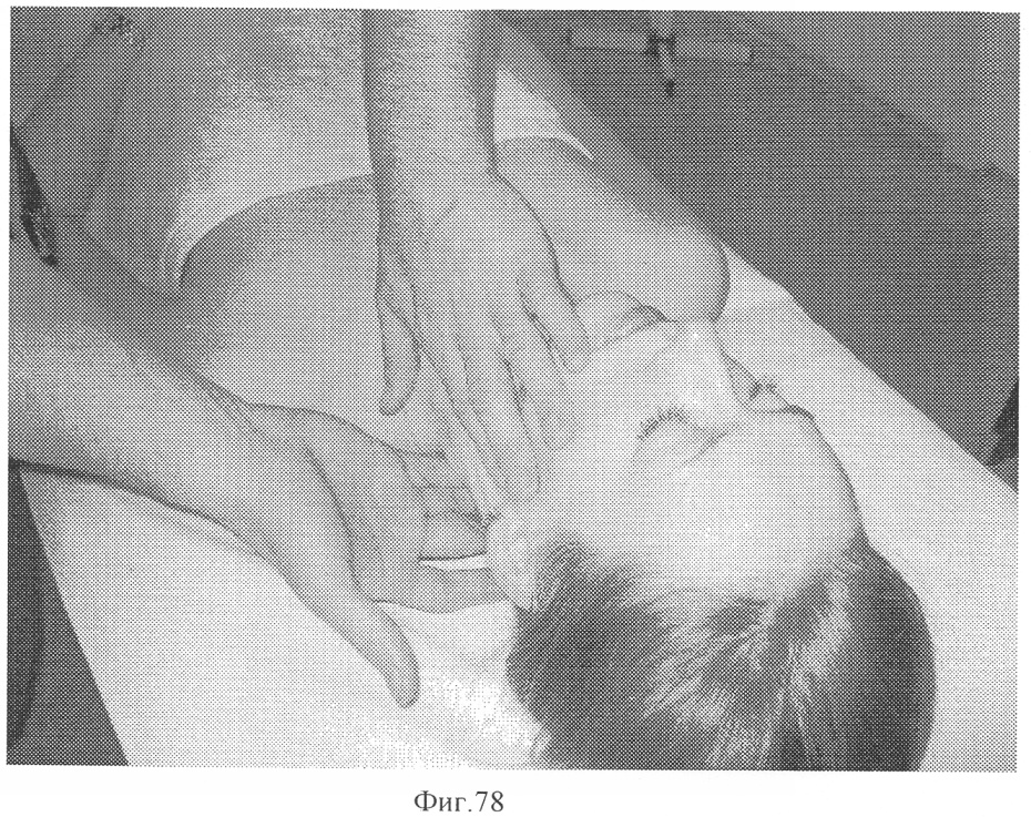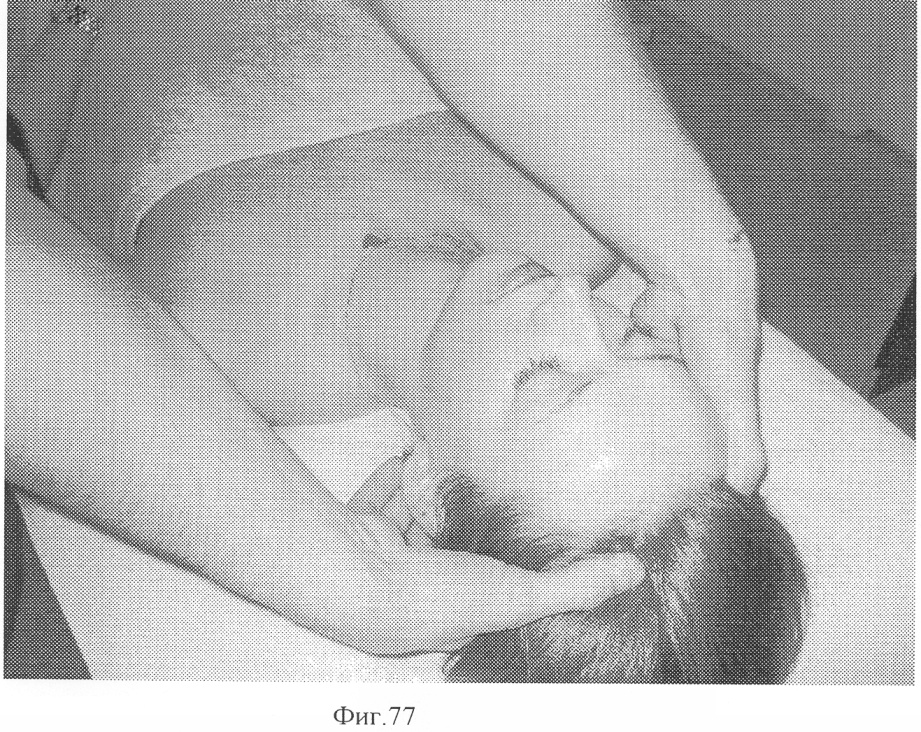 Далее, придерживая голову правой рукой, вновь возвращаются к стимуляции затылочных нервов вибрационными движениями (фиг.71), меняя положение рук через 10-15 секунд (фиг.72), и так 5-7 раз, затем глубокими плавными движениями стимулируют область подглазничного нерва большими пальцами 15-20 секунд (фиг.73) и надглазничного нерва (фиг.74), попеременно 3-5 раз, меняя при стимуляции надглазничного нерва положение пальцев (фиг.75).