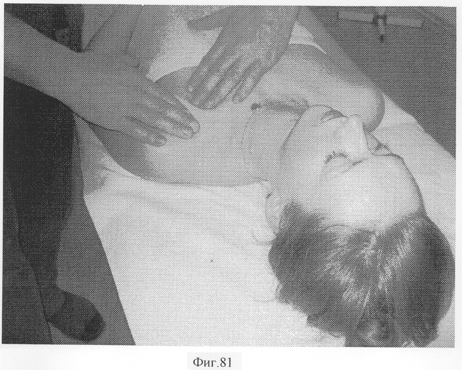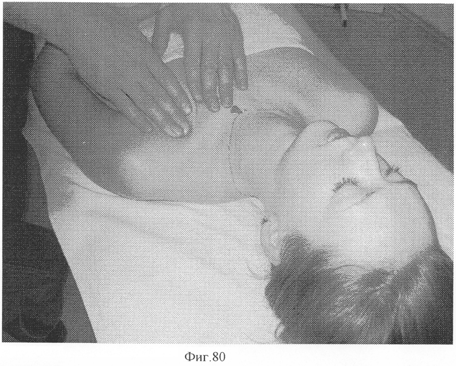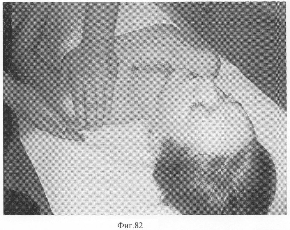 Завершают массаж поглаживанием волосистой части головы ладонной поверхностью 20-30 секунд (фиг.76), области в проекции затылочных нервов 20-30 секунд (фиг.77), грудинно-ключично-сосцевидной мышцы 20-30 секунд (фиг.78), больших грудных мышц 20-30 секунд (фиг.79), чередуя с легким разминанием 20-30 секунд 3-4 раза (фиг.80, 81). Завершается массаж чередованием плавных, медленных поглаживаний шеи 20-30 секунд (фиг.82) и головы, 20-30 секунд (фиг.83, 84), 5-7 раз.