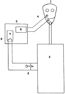 Способ поясняется с помощью чертежа. Под маску 1 больному, как и в прототипе [2], подают воздух под давлением от микропроцессора 2, имеющего контактор 3 для ручного включения подачи удвоенного давления под маску 1 больного. Сигнал от подбородочных ЭМГ – электродов 4 подают на вход блока управления 5, включающего селектор импульсов 6, схема которого может быть спроектирована на базе данных [3], счетчика импульсов 7, опубликованного в [4] со стандартным релейным элементом 8, который включают параллельно контактору 3.