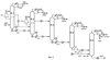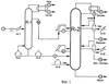 первые колонны R1, R2 разделены надвое глухими тарелками, в верхних частях R1, R2 давление выше атмосферного, в нижних атмосферное. Остальные три (или более) колонны R3, R4, R5 – вакуумные, причем R5 – паровая; отборы из конденсаторов колонн R1, R2 берут при температурах 35-45°С;