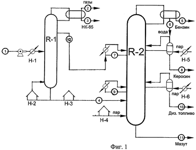 при этом две первые колонны R1, R2 разделены глухими тарелками надвое, их верхние и нижние половины объединены трубами 2, 8 через компрессоры К1, К2; а их глухие тарелки соединены трубами 4, 13 с колоннами R2, R3 соответственно, трубы 20, 22 выводят мазут и конденсат воды из колонны R5, а труба 1 подводит к низу R1 исходное сырье;