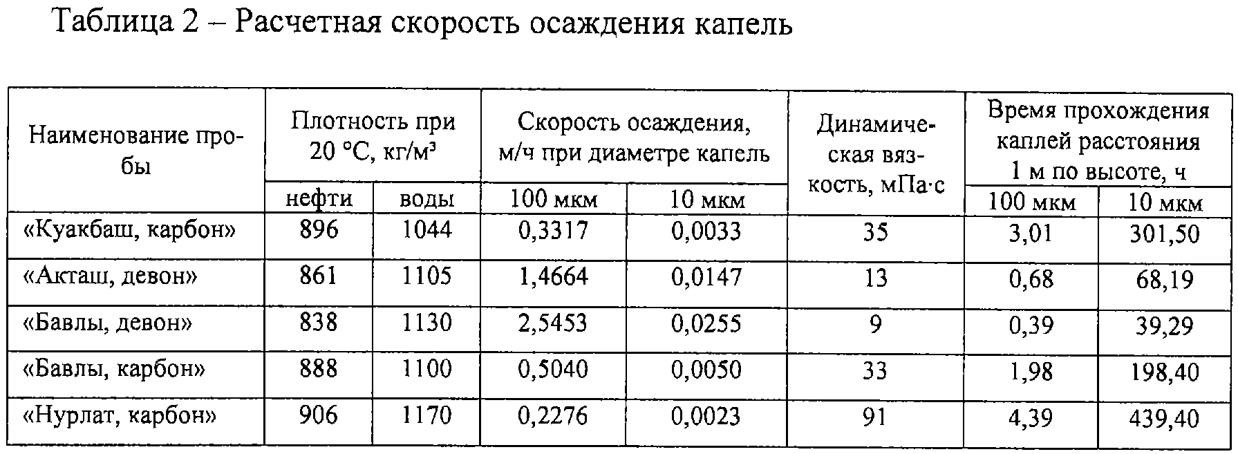 Проведенные эксперименты с сырьем, поступающим на вход установок подготовки нефти, позволили дать оценку возможности использования предлагаемого способа. Сущность экспериментов заключалась в следующем. На УПН отбиралось поступающее сырье. После статического отстаивания в течение заданного времени, составляющего 2, 15, 24 ч, производилось разделение жидкости на 6 проб по высоте отстойника, каждая из которых оценивалась по значениям параметров, определяющих качество подготовленной нефти, а именно: объемной доле эмульгированной воды и концентрации хлористых солей. Кроме того, в пробах замерялась концентрация сульфида железа, плотность, производился дисперсный анализ. В таблице 1 приведены данные замеров параметров сырья, а в таблице 2 – расчет скорости осаждения капель по формуле Стокса.