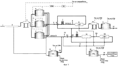 Пластовая вода, отделяющаяся в КДФ 2 и резервуарах предварительного сброса воды 4, направляется в резервуар очистных сооружений (OC1) 15. Дренаж из отстойника ступени обезвоживания 14 направляется в резервуар разделения промежуточного слоя (ОС2) 16. Дренаж из отстойников ступени обессоливания 9, 9А насосом 17 и пленочная нефть из резервуара очистных сооружений 15 насосом 18 подкачивается в поток жидкости, поступающей во входной патрубок насоса 5А (поток II). Промежуточный слой из резервуара 16 направляется насосом 19 на блок обработки промежуточных слоев.