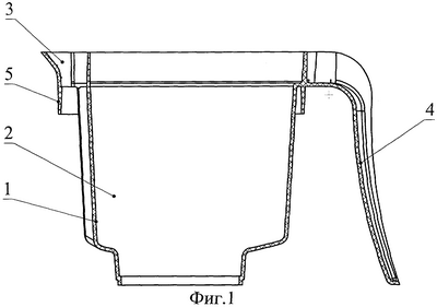 Приемная емкость для жидкости 1 по первому варианту (фиг.1) состоит из двух секций, одна из которых предназначена для очищаемой жидкости 2, а другая для излива очищенной жидкости 3, ручки 4 и средства крепления 5, расположенного ниже входного отверстия по всей окружности приемной емкости 1, выполненного например в виде цилиндрического выступа. Контейнер, выполненный по первому варианту (фиг.2) состоит из вышеописанной приемной емкости 1, вставленной в емкость для очищенной жидкости 6. Емкость для очищенной жидкости 6 сформирована из верхней части 7 с входным отверстием, выполненной литьем под давлением с возможностью упрочнения ее за счет средства 9 для обеспечения упрочнения горловины 8. Средство 9 расположено по всей окружности верхней части емкости ниже горловины 8 и может быть выполнено в виде, например, буртика. Верхняя часть 7 емкости 6 переходит в корпус 10, выполненный методом раздува.