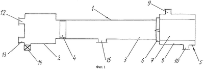 При пуске устройства при давлении 1 атм. очищаемое вещество через патрубок 9 подают в реакционную камеру 8 фотохимического реактора 5, одновременно в камеру сгорания 2 через патрубки 12, 13 подают соответственно чистый природный газ (метан) и воздух, а в трубу 3 плазматрона 1 через патрубок 15 – рабочий газ (одноатомный). После заполнения вышеуказанных объемов устройства в камере сгорания 2 включают зажигание (на фиг. не показано), в результате чего происходит сгорание метана, продукты которого образуют “толкающий” газ с давлением до 200 атм., который приводит в движение поршень 4, адиабатически сжимающий рабочий газ в части трубы 3 плазматрона 1, примыкающей к сопловому узлу 6, до давления 1000 атм. и температуры 10000 К и более, рабочий газ через сопловой узел 6, выполненный в виде сверхзвукового сопла (напр., сопло Лаваля), перетекает без потерь накопленной энергии в технологическую камеру 7 фотохимического реактора 5, где происходит высвечивание в области длин волн с максимумом 200 нм, то есть в области максимального поглощения излучения сероводородом или же в области длин волн, характерных для максимального поглощения известными примесями в нефтепродукте или воде. В результате поглощения ультрафиолетового излучения, прошедшего через кварцевую перегородку 11 в реакционную камеру 8, происходит разложение в данном случае сероводорода в очищаемом газе (остальные компоненты очищаемого газа фотоны из этой области спектра не поглощают) на водород и элементарную серу, которые через выходной патрубок 10 выводятся из реакционной камеры 8 для отделения от серы. Смесь метана и водорода может использоваться для коммерческих и иных целей, а ее доля 1-10% подается в камеру сгорания 2 при повторном цикле. После завершения вывода продуктов диссоциации с очищенным веществом из реакционной камеры 8 открывается выхлопной клапан 14 в камере сгорания 2 и под давлением рабочего газа поршень 4 вытесняет “толкающий” газ (в других условиях возможна откачка этого газа) и одновременно возвращается в исходную позицию. Далее этот цикл повторяется с выбранной частотой, которая зависит от производительности устройства.