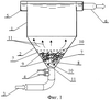 На фиг.1 схематически изображен вертикальный вихревой смеситель, на фиг.2 – фрагмент камеры, установленной в нижней части с размещенными в ней свободно перемещающимися элементами. Смеситель имеет корпус 1 квадратного или круглого в плане сечения с пирамидальной или конической нижней частью 2, с центральным углом между наклонными стенками 30-45°, трубопровод 3 подачи исходной воды в нижнюю часть 2 смесителя, узел 4 подачи реагентов и сборный желоб 5 с трубопроводом 6 отвода воды, смешанной с реагентами. В нижней пирамидальной части 2 корпуса 1 установлены камеры 7, отделенные друг от друга вертикальными стенками 8, в камерах 7 размещены свободно перемещающиеся элементы 9, снизу и сверху камер 7 закреплены горизонтальные решетки 10, ограничивающие высоту перемещения элементов 9. Стрелками 11 показано направление восходящего постепенно расширяющегося потока 11, проходящего через нижнюю горизонтальную решетку 10 в камеры 7 и за счет скоростного напора, обеспечивающего взвешивание свободно перемещающихся элементов 9 и их вращательное (показано стрелками 12) и поступательное перемещение в пределах камер 7.