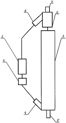 В реактор 1 подают потоки газообразных углеводородов и нагретой твердой дисперсной фазы. Между этими потоками в реакторе 1 осуществляется тепловой тип взаимодействия. Отработанная твердая дисперсная фаза, представляющая собой, например, частицы, поверхность которых покрыта слоем углерода, после выхода из реактора 1, проходя через дозатор 2, через патрубок 4 ввода твердой дисперсной фазы, попадает в регенератор 3. В регенераторе 3 за счет высокой температуры частиц твердой дисперсной фазы происходит возгорание горючей газовоздушной смеси, подаваемой в регенератор 3 через патрубок 5 ввода горючей газовоздушной смеси, причем центрами горения являются сами частицы твердой дисперсной фазы. Так как скорости газовоздушной смеси существенно превышают скорости витания частиц, в регенераторе 3 реализуется режим “пневмотраспортного” течения твердой дисперсной фазы. В это время происходит сгорание слоя углерода на частицах твердой дисперсной фазы. Регенерированная твердая дисперсная фаза и газообразные продукты сгорания на выходе из регенератора 3 попадают в сепаратор 6. После разделения в сепараторе 6 продукты сгорания выводятся из системы через патрубок 7 вывода продуктов сгорания, а регенерированная твердая дисперсная фаза через патрубок 8 вывода регенерированной твердой дисперсной фазы возвращается в реактор 1.