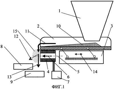 На чертежах показаны загрузочный бункер 1, желоб 2 вибрационного питателя 3, соленоид 4, продольная ось 5 соленоида, направление 6 действия магнитного поля соленоида на этапе переднего фронта импульса (его возрастающем участке), генератор 7 импульсных токов, приемная емкость 8, емкость сбора отходов 9. Кроме того, показаны слой 10 смеси дисперсных немагнитных материалов и направление 11 движения ее потока, направление 12 движения потока проводящих частиц, направление 13 движения потока непроводящих частиц, направление 14 движения желоба питателя.