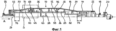 Как показано на фиг.1, центрифуга со шнековым устройством для выгрузки осадка имеет ротор 10, состоящий из среднего цилиндрического барабана 12 и двух жестко соединенных с ним конических барабанов 14 и 16. Для установки ротора 10 в непоказанном корпусе служат два подшипника 18 качения. В правой части фиг.1 показан шкив 20 для привода ротора 10 во вращение вокруг горизонтальной оси 24, а также редуктор 22.