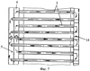На фиг.6 показана схема движения охладителя – воды из коллектора 4 в коллектор 5 (направления движения по трубам 3 показаны стрелками); см. также фиг.7-9. Можно часть труб соединять криволинейными соединительными деталями 12, 13 (фиг.8), так что охладитель до отвода от валка пройдет в бандаже вдоль его образующей не один раз, а несколько: по фиг.8 – три раза, и только после этого попадет в коллектор 5 и будет отведен от валка в систему охлаждения воды. В варианте по фиг.9 коллекторы 4 и 5 расположены на поверхности валка с одной стороны от бандажа, а с другой его стороны камеры 14 обеспечивают поворот охладителя в указанной камере.